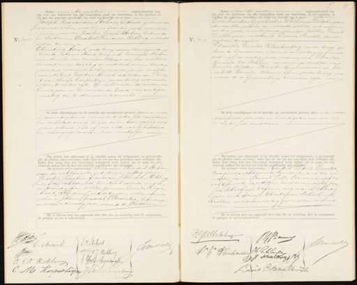 No. 2455 Heden vies Augustus het Juis der gemeenten vereckenn, ten ande den Aunelif aan te guun:Notdedee va zijn voor ons Ambtenaar van den burgerlijken stand van Amsterdam, in het openbaar, in Joseph Franciscus Stokvis, bediende, geboren en J: wonende alhier, oud drie en twintig jaren, meerder jarige zoon van Jacobus Joseph ttokvis bediende en Catharina Elisabeth Francisca Rohling, wonende alhier, ter eenre en Christina Avink, zonder beroep, volgens hare opgaven ge „boren te Tateison Staat Jerseij in de Vereenigde Staten van Amerika, den zevenden baart des jaars achttien honderd een en tachtig en mitsdien drie en twintig jaren oud wonende alhier, meerderjarige dochte van Albert Jacobus Avink, overleden en Chris „tina Maria Karpesteijn, zonder beroep, wonende alhier, ter andere zijde. En verklaarden de ouders de bruidegoms en de moeder der bruid, voor ons tegen woordig, toe te stemmen in dezen echt De beide afkondigingen tot dit huwelijk zijn onverhinderd geschied, alhier den me en twintigsten en een en dertigsten Juli laatstleden En verklaarde ons de bruid, onder eede, dat zij zieh geene geboorte- akte of eene akte van bekendheid ter vervanging daarvan, kan verschaffen. Wij hebben hun afgevraagd of zij elkander nemen tot echtgenooten, en getrouwelijk alle de plichten zullen vervullen, welke door de wet aan den huwelijken staat verbonden zijn Nadat deze vraag door hen bevestigend beantwoord werd, hebben wij, in naam der we- uitspraak gedaan dat zij door het huwelijk aan elkander zijn verbonden. Als getuigen waren tegenwoordig: Salomon Hendrik Stokvis oom dls echtgenoots, oud drie en vyftig jaren Jacobus Josephus franciscus Johannes Rohlin neef des echtgenoots kantoorbediende oud ze en twintig jaren, Willem Gerardus Cornelis Hogen „hout, eistrograaf, oud dertig jaren, allen wonende alhier en Johann friegeriek Rodenberg, hofmeeste oud drie en twintig jaren, wonende te Rotterdam. En is hiervan door ons opgemaakt deze akte, die, na voorlezing, door de comparanten, de getuigen en ons is onderteekend. No. 2454 Heden vier Augustus zijn voor ons Ambtenaar van den burgerlijken stand van Amsterdam, va het openbaar, n het huis der gemeente, verschenen, ten einde een huwelijk aan te gaan: overhardus Gijsbertus Wilhelmus Veldhuijzen, steendrukker, geboren en wonende alhier, oud negen en veertig jaren, meerderjarige zoon van Willem Fredrik Veldhuyzen en Maria Louisa Bartels, beiden overleden, ter eenre en Petronella Cornelia Klinkenberg, zonder beroep, ge „ boren te Loosduinen, wonende te Watergraafsmeer oud vijf en veertig jaren, weduwe van Charles Amand De Bruijne meerderjarige dochter van Cornelis Willem Klinkenberg overleden en Eli „sabeth Cornelia Warmenhoven, zonder beroep, wo „nende te 's Gravenhager ter andere zijde De beide afkondigingen tot dit huwelijk zijn onverhinderd geschied, alhier en te water „ graafsmeer den vier en twintigsten en een en dertigsten Juli laatstleden Wij hebben hun afgevraagd of zij elkander nemen tot echtgenooten, en getrouwelijk alle de plichten zullen vervullen, welke door de wet aan den huwelijken staat verbonden zijn Nadat deze vraag door hen bevestigend beantwoord werd, hebben wij, in naam der wet uitspraak gedaan dat zij door het huwelijk aan elkander zijn, verhonden Als getuigen waren tegenwoordig: Hendrik Pieter le Euvelie zwager des echtgenoots, kruidenier, oud zes en veertig jaren, Barend Jullo Bennema, neef de Echtgenoots, expediteur, oud drie envijftig jaren Jan Schalkwijk, koofman, oud vier en zevenden jaren en Lodewijk Christoferus Schalkwijk Hailleur, oud drie en dertig jaren, allen wonende alhier En is hiervan door ons opgemaakt deze akte, die, na voorlezing, door de comparanten, de getuigen en ons is onderteekend. 4 WJ P. W: Stokvit Woolde C. Avink FJJ.F.J. Rohling Joo Del Hagenban C EF Rohling C. M Karpesteyn Jet Raterberg PMElelekenje BJ Beunens J M Dr V o P.Eenhenker H P. t Constiee JJ Schalkryg Lrus CSchalkwysle