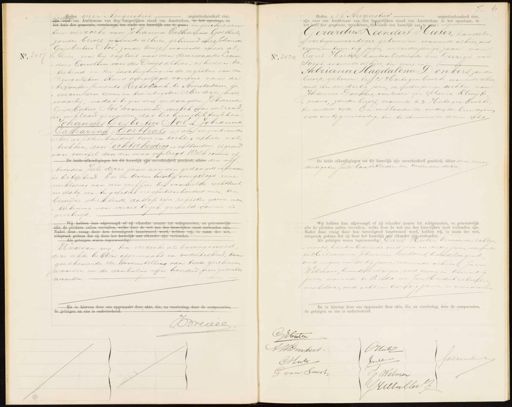 No. 2457 vier Augustus negentienhonderd vier ijn vaor ons Ambtenaar van den burgerlijken stand van Amsterdam, in het openbaar, in het huis der gemeente, verschenen, ten einde een huwelijk aan te gaan: ingeschieven ten verzoeke van Johanna Catharina Goethals, zonder beroep, wonende alhier, gehuwd met Johannes Gijsbertus Hoe, zonder beroep, wonende mede al „hier een bij exploit van den deurwaarder Leonal dus Cornelius van der Duys alhier, op heden be teekend en ter inschrijving in de registers van den Turgerlijken stand overgelegd vonnis van de Arrondissements Rechtbank te Amsterdam, ge „ wezen den zeven en twintigsten Mei dezes Jaars, waarbij, nadat tegen den gedaagden Johannes Gijsbertus Noe voornoemd verstek was verleend is verklaard gewarden, dat het huwelijk tusschen Johannes Gijsbertus Nol en Johanna Catharina Goethals, op den negentienden Mei achttienhonderd twee en tachtig alhier vol „trokken, door echtscheiding is ontbonden, opgrond van overspel door den man gepleegd. Welk vonnis op De beide afkondigingen tot dit huwelijk zijn onverhinderd geschied, alhier den vijf„ „tienden Juli dezes jaars aan den gedaagde in persoon is beteekend. En is tevens hierbij overgelegd eene verklaring van den griffier bij voormelde rechtbank in dato een Augustus negentienhonderd vier, ten bewijze strekkende, dat op zijn register geene aan „ teekening van verzet tegen gemeld vonnis is geschied. ij hebben hun afgevraagd of zij efkander nomen tot echtgenooten, en getrouwetij alle de plichten zullen vervullen, welke door de wet aan den huwelijken staat verbonden zijn Nadat deze vraag door hen bevestigend beantwoord werd, hebben wij, in naam der wet. uitspraak gedaan dat zij door het huwelijk aan elkander zijn verbonden Als getuigen waren tegenwoordig Waarvan wij ten verzoeke als bovengemeld deze akte hebben opgemaakt en onderteekend, bevend goedkeurende de bovenstelling van twee geschreven woorden en de doorhaling van honderd mie gedrukte woorden. En is hiervan door ons opgemaakt de getuigen en ons is onderteekend. No. 2524 Heden elf Augustus het hut Det genlende vereeleden Aeeinde een buweijk daie omn. woddeade va zijn voor ons Ambtenaar van den burgerlijken stand van Amsterdam, in het openbaar, in Gerardus Leendert Ruter, handels, vertegenwoordiger, geboren en wonende alhier, oud zeven en twintig jaren, meerderjarige zoon van Carel Huter kantoorbediende en Gerrigje van Soeft wonende alhier, ter eenre en Adriana Magdalena Donkers, zonder beroep, geboren te is Hertogenbosch, wonende alhier oud een en dertig jaren, meerderjarige, dochter van Johannes Donkers, overleden en Maria Kluijf „mans, zonder beroep, wonende te is Hertogenbosch, ter andere zijde. En verklaarden de ouden des bruidegoms voor ons tegenwoordig, toe te stemmen in dezen echt De beide afkondigingen tot dit huwelijk zijn onverhinderd geschied, alhier den een en „ dertigsten Juli laatstleden en zevenden dezer Wij hebben hun afgevraagd of zij elkander nemen tot echtgenooten, en getrouwelijk alle de plichten zullen vervullen, welke door de wet aan den huwelijken staat verbonden zijn Nadat deze vraag door hen bevestigend beantwoord werd, hebben wij, in naam der wet, uitspraak gedaan dat zij door het huwelijk aan elkander zijn verbonden Als getuigen waren tegenwoordig: Carel Huter, broeder des echtge „noots kantoorbediende, oud een en dertig Jaren wonende te Hilversum, Johannes Swildens, handelsagent oud negen en dertig jaren, wonende alhier, Jan Welman, bandelsreizigen, oud zeven en twintig jaren, wonende te Breda en Jan Hendrik Auller makelaar, oud acht en twintig jaren, wonende allie En is hiervan door ons opgemaakt deze akte, die, na voorlezing, door de comparanten, de getuigen en ons is onderteekend. Gruter AH Doukers Sttute falkenbewre Gulden MHut G van Soert J Welman Culull