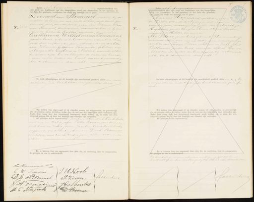 No. 2525 Heden elf Augustus negentienhonderd vier, zijn voor ons Ambtenaar van den burgerlijken stand van Amsterdam, in het openbaar, in het huis der gemeente, verschenen, ten einde een huwelijk aan te gaan: Leonard van Bommel, matroos bij de marine, geboren en wonende alhier oud twee en twintig jaren, minderjarige zoon van Douwe Elias van Bommel timmerman wonende alhier en Geerfruida frederika Korthof overleden ter eenre en Catharina Wilhelmina Somasini, zonder beroep, geboren te Groningen, wonende alhier oud drie en twintig jaren meerderjarige dochter van Johannes Antonius Somasini, schilder en Bargaretha Catharina Nissink, wonende alhier ter andere zijde. En verklaarden de vader des bruide goms en de ouders der bruid, voor ons tegenwoordig, toe te stemmen in dezen echt. De beide afkondigingen tot dit huwelijk zijn onverhinderd geschied, alhier den een en dertigsten Juli laatstleden en zevenden dezer. Wij hebben hun afgevraagd of zij elkander nemen tot echtgenooten, en getrouwelijk alle de plichten zullen vervullen, welke door de wet aan den huwelijken staat verbonden zijn. Nadat deze vraag door hen bevestigend beantwoord werd, hebben wij, in naam der wet, uitspraak gedaan dat zij door het huwelijk aan elkander zijn verbonden. Als getuigen waren tegenwoordig: Jacobus Hendrik Koch huie oud een en zestig jaren, Pieter Kooren, metselaar oud twee en zestig jaren, Jacobus Gerardus dbenks, sappoost, verd zestig jaren en Dirk Bouwa, winkelier, oud een en zestig jaren, allen wonende alhier En is hiervan door ons opgemaakt deze akte, die, na voorlezing, door de comparanten, de getuigen en ons is onderteekend. No. Heden elftigsstig burgerlijken Stand van Amsterdam, in het openbaar, in het huis der gemeente, verschenen, ten einde een huwelijk aan te gaan: ohannes Hopmans, apotheker, geboren te Helder, wonende te Nimegen, oud negen en twintig jaren, meerderjarige zoon van Mbatthijs Hopmans, zonder beroep en Anna Maria Boorn wonende te Helder, ter eenre en Ake Bloos, zonder beroep, geboren te Schiermonnikoog wonende alhier oud vier en dertig Jaren, meerderjarige dochter van Janne Bloos, overleden en Jeltje Jans Posthuinus, zonder beroep, wonende alhier. En ver „klaarden de ouders des bruidegoms, bij notarisele akte, toe te stemmen in dezen echt De beide afkondigingen tot dit huwelijk zijn onverhinderd geschied, alhier en te Nis „megen den een en dertigsten Juli laatstleden en zevenden dezer Wij hebben hun afgevraagd of zij elkander nemen tot echtgenooten, en getrouwelijk alle de plichten zullen vervullen, welke door de wet aan den huwelijken staat verbonden zijn. Nadat deze vraag door hen bevestigend beantwoord werd, hebben wij, in naam der wet, uitspraak gedaan dat/zij door het huwelijk aan elkander zijn verbonden. Als getuigen /waren tegenwoordig: En is hiervan door ons opgemaakt deze akte, die, na voorlezing, door de comparanten, de getuigen en ons is onderteekend De doorhaling, wegens abusieve inschrijving, goedgekeurd De Ambtenaar van den Burgerlijken stand van Amsterdam hBomme JH Hooh C W Samarini Salzenbarg D. E. Bommel. J. Kooren JA. Domasend HGMenkt M C Miersink J Voume alkentin