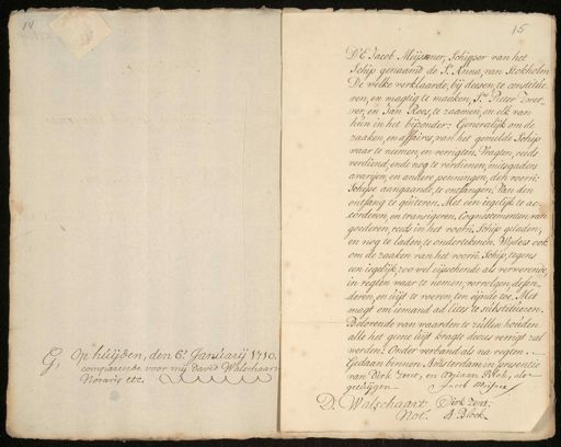 ren en magtig te maaken, Sr. Pieter Twer ver, en Jan Roos, te zaamen, en elck van hun in het bijsonder Generalijk om de raaken, en affaires, van het gemelde Schip waar te neemen, en verrigten cragten, reeds verdiend ende nog te verdienen, mitsgaders avarijen, en andere penningen, den voorn. Schepe aangaande, te ontfangen van den ontfang te quiteren. Met een iegelijk te ac¬ cordeeren, en transigeren, Cognossementen van goederen, reede in het voorn. schip geladen en nog te laden te ondertekenen. Wijders ook om de zaaken van het voorn. schip tegens een iegelijk zoo wel eysschende als verwerende in regten waar te nemen, vervolgen, desen deren, en uijt te voeren, ten eijnde toe. Met magt om iemand ad lites te substitueren. Belovende van waarden te zullen houden alle het geene uijt kragte deezes verrigt zal werden. Onder verband als na regten. Gedaan binnen Amsterdam in presentie van Dirk Cent, en Adriaan Blok, als Jacob Meijer, getuijgen Walschaart Dirk en Nots. A. Block