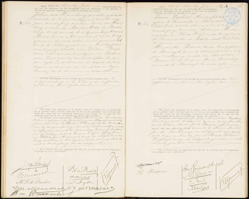 No. 610. Heden zes en twintig Juli negentienhonderd zes zijn voor ons Ambtenaar van den burgerlijken stand van Amsterdam, in het openbaar, in het huis der gemeente, verschenen, ten einde een huwelijk aan te gaan: Johan van Hamburg, opzichter, geboren en wonende te s Gravenhage oud zes en twintig- jaren, meerderjarige zoon van Louis van Ham„ burg overleden en Maria Alida de Bordes zonder beroep, wonende te 's Gravenhage, ter eenre, en Berendina Moransard, zonder beroep, geboren en wonende alhier, laatst gewoond heb„ bende te Tilburg, oud vier en twintig jaren meerderjarige dochter van Willem Benja„ min Moransard, uitgever en Barbard van Doorneveld, wonende alhier, ter an„ dere zijde. En verklaarden de moeder des brui„ degoms en de ouders der bruid, voor ons tegen„ woordig, toe te stemmen in dezen echt. De beide afkondigingen tot dit huwelijk zijn onverhinderd geschied, alhier te s Gravenhage en te Tilburg den vijftienden en twee en twintigsten dezer Wij hebben hun afgevraagd of zij elkander nemen tot echtgenooten, en getrouwelijk alle de plichten zullen vervullen, welke door de wet aan den huwelijken staat verbonden zijn. Nadat deze vraag door hen bevestigend beantwoord werd, hebben wij, in naam der wet, uitspraak gedaan dat zij door het huwelijk aanelkander zijn verbonden. Als getuigen waren tegenwoordig:: Philip Antonie de Bordes, con„ toleur- magazijnmeester bij de posterijen en telegrafie, oud zestig Jaren, wonende te Haarlem, Willem George de Bordes, dom„ wies bij den geneeskundigen dienst der Laudmacht, oud zeven en vijftig jaren, wonende te 's Gravenhage, Lodewijk Dijker, oom der echtgenoote zonder beroep oud vijf en vijftig jaren, en Willem Jan Moransard, boeder der echtgenoote, zonder beroep, oud zeven en twintig jaren, beiden wonende alhier, de aerste en tweede getuige oom der echtgenoott En is hiervan door ons opgemaakt deze akte, die, na voorlezing, door de comparanten, de getuigen en ons is onderteekend. vnarur No. 611. en twintig nagentienhonderd zas, zijn voor ond Amtenaat vaa den burgerlijken stand van Amsterdam, in het openbaar, in het huis der gemeente, verschenen, ten einde een huwelijk aan te gaan: Isaac Raphaël Arrias, fabrikant 15 geboren te Paramaribo in Nederlandsch 0 West Indie, wonende alhier, oud drie en dertig jaren, meerderjarige zoon van Salomon Arrias, overleden en Eliza Weijl zonder beroep, wonende te Paramaribo in Nederlandsch West Indie ter eenre, en Hendrika Braun, zonder beroep geboren te Beverwijk, wonende alhier, oud zeven en dertig jaren, menrderjarige dochter van Christiaan Braun, zonder beroep en Maria Bisschap, wonende te Beverwik, ten andere zijde. De beide afkondigingen tot dit huwelijk zijn onverhinderd geschied, alhier den vijftienden en twee en twintigsten dezer Wij hebben hun afgevraagd of zij elkander nemen tot echtgenooten, en getrouwelijk alle de plichten zullen vervullen, welke door de wet aan den huwelijken staat verbonden zijn Nadat deze vraag door hen bevestigend beantwoord werd, hebben wij, in naam der wet. uitspraak gedaan dat zij door het huwelijk aan elkander zijn verbonden. Als getuigen waren tegenwoordig: Jonkheer Arnout van Keigerberg Versluijs, zonder beroep, oud twee en dertig jaren, wo nende alhier, Martin Jacob Kermer aannemer, oud zes en dertig jaren, wonende te Nieuwer Amstel, Jan ten Brink, zwager des echtgenoots advocaat, oud negen en twintig jaren en Herman Willem Weijlingh, zwager des echtgenoots, geneesheer, oud acht en dertig jaren, beiden wonende alhier En is hiervan door ons opgemaakt deze akte, die, na voorlezing, door de comparanten, de getuigen en ons is onderteekend. J. VanHahur P: A. de Boeter Brnorendan Me Border M: A de Bades L Dyken BB. Mvvansaed W.J. Jdransalh B van Dovenvele Nvveree Aa aidesorte H Braeen Av: Mm 7 ten Buut AZ Weyys