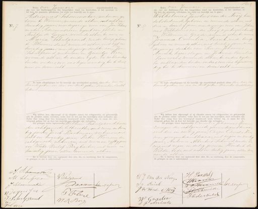 No. 7 Heden vier Januari negentienhonderd zes zijn voor ons Ambtenaar/ van den burgerlijken stand van Amsterdam, in het openbaar, in het huis der gemeente, Verschenen, ten einde een huwelijk aan te gaan: Adrianus Schoenmaker, werkman, ge„ boren te Wormer wonende alhier oud acht en twintig jaren, meerderjarige zoon van Jan Schoen„ maker Adrianuszoon, agent van politie en Aeeltje de Gooijer, wonende alhier, ter eenre, en Maria Schulpzand, zonder beroep, geboren te Bloemendaal, wonende alhier, oud vijf en twintig jaren meerderjarige dochter van Jan Schulpzand werkman en Guurtje Plore, wonende alhier, ter andere zijde. on verklaarden beider ouders voor ons tegenwoordig toe te stem„ men in dezen echt- De beide afkondigingen tot dit buwelijk zijn onverbinderd geschied, alhier den vier en twintigsten en een en dertigsten December laatst„ leden.- Wij hebben hun afgevraagd of zij elkander nemen tot echtgenooten, en getrouwelijk alle de plichten zullen vervullen, welke door de wet aan den huwelijken staat verbonden zijn. Nadat deze vraag door hen bevestigend beantwoord werd, hebben wij, in naam der wet, uitspraak gedaan dat zij door het huwelijk aan elkander zijn verbonden. Als getuigen waren tegenwoordig: Willem Schulpzand, broeder der echtgenoote letterzetter oud zeven en twin tig jaren, Jacob Raakman werkman oud acht en twintig jaren, Pieter Flore oom der echtgenoote werkman oud zeven en vijftig jaren en Wiebe Roel of Bergbarbier, oud zeven en twintig jaren, allen wonende alhier. En is hiervan door ons opgemaakt deze akte, die, na voorlezing, door de comparanten, de getuigen en ons is onderteekend. No. 8 Heden vier Januari negentienhonderd zes, zijn voor ons Ambtenaar van den burgerlijken stand van Amsterdam, in het openbaar, in het huis der gemeente, verschenen, ten einde een huwelijk aan te gaan: Withelmus Jacobus van der Hooij han delsbediende geboren en wonende alhier, oud drie en twintig jaren, meerderjarige zoon van Johan nes Wilhelmus van der Nooij, winkoopersknecht en Willemina Grader, wonende alhier, ter eenreg Joanna Cornelia Anink, zonder beroep, geboren en wonende alhier, oud twintig jaren, min derjarige dochter van Simon Johannes Anink, koperslager en Joanna Cornelia Pauwels wonende alhier, ter andere zyde En verklaarden beider ouders voor ons tegenwoor dig toe te stemmen in dezen echt- De beide alkondigingen tot dit buwelijk zijn onverhinderd geschied, alhier den vier en twintigsten en een en dertigsten December laatstleden Wij hebben hun afgevraagd of zij elkander nemen tot echtgenooten, en getrouwelijk alle de plichten zullen vervullen, welke door de wet aan den huwelijken staat verbonden zijn Nadat deze vraag door hen bevestigend beantwoord werd, hebben wij, in naam der wet uitspraak gedaan dat zij door het huwelijk aan elkander zijn verbonden. als getuigen waren tegenwoordig: Cornelis Johannes Framer zwager der echtgenoote gemeente ambtenaar, oud drie en veertig jaren, Casper Cornelis Kra mer gemeenteambtenaar, oud negen en veertig jaren, Antonie Albertus Schmid zonder be roep, oud negen en dertig jaren en Hendrik de Wilde, bode, oud acht en dertig jaren, allen wo nen de alhier — En is hiervan door ons opgemaakt deze akte, die, na voorlezing, door de comparanten, de getuigen en ons is onderteekend. A. Schuemmake W Schulphand M Schulpzand J Schoenmaker JHaarenHnbogkende nde gooiter T Flere J Schulpzand W.R Berg G H PanWels WJ van der Nooy tkransen DKeame eroiher J C Snink H Schmnid J W Vande Noor Abdeskelde W Gradten S JAnink