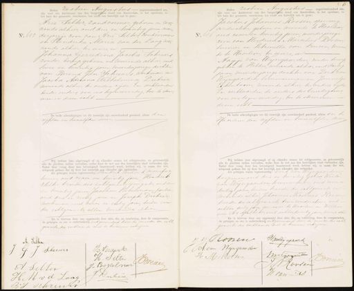 No. 685 Heden zestien Augustus negentienhonderd zes, zijn voor ons Ambtenaar van den burgerlijken stand van Amsterdam, in het openbaar, in het huis der gemeente, verschenen, ten einde een huwelijk aan te gaan Arie Selter zandvormer, geboren en wo„ nende alhier, oud drie en twintig jaren meer„ derjarige zom van Arie Selter, zandvormer en Hendrika Maria van der Laag, wo„ nende alhier, ter eenre, en Johanna Gerredina Jacoba Schreurs, zonder beroep, geboren en wonende alhier, oud twee en twintig jaren meerderjarige dochter van Berend Jan Schreurs, werkman en Jacoba Adriana Wilhelmina Dubiez, wonende alhier, ter andere zijde. En verklaarden beider ouders, voor ons tegenwoordig, toe te stem„ men in dezen echt. De beide afkondigingen tot dit huwelijk zijn onverhinderd geschied, alhier den vijfden en twaalfden dezer Wij hebben hun afgevraagd of zij elkander nemen tot echtgenooten, en getrouwelijk alle de plichten zullen vervullen, welke door de wet aan den huwelijken staat verbonden zijn Nadat deze vraag door hen bevestigend beantwoord werd, hebben wij, in naam der wet. uitspraak gedaan dat zij door het huwelijk aan elkander zijn verbonden. Als getuigen waren tegenwoordig: Hendrik Verdonk, Manufde turier oud zeven en twintig Jaren Hendrik Selter, broeder des echtgenootsijzer giter, oud een en twintig jaren Jacobus Bokelman, portier oud drie en zestig jaren en Joseph Dubier, werkman oud zeven en zestig jaren, beiden oom der echtgenoote allen wonende alhier. En is hiervan door ons opgemaakt deze akte, die, na voorlezing, door de comparanten, de gebuigen en ons is onderteekend uitgezonderd door de moeder der echt„ genoote, die verklaarde niet te kunnen schrijven. No. 680 Heden zestien Augustus negentienhonderd zes, zijn voor ons Ambtenaar van den burgerlijken stand van Amsterdam, in het openbaar, in het huis der gemeente, verschenen, ten einde een huwelijk aan te gaan: Jacobus Johannes Roosen, spoorweg„ conducteur, geboren en wonende te Haarlem oud zeven en twintig jaren meerderjarige 1. 6 zoon van Hendricus Marcelus Roosen huinier en Petronella van Leuven, wonen„ de te Haarlem, ter eenre, en Aagje van Wijngaarden, zonder beroep, geboren te Helder, wonende alhier, oud dertig jaren meerderjarige dochter van Dirk van Wijngaarden timmerman en Jannetje Eikenboom, wonende alhier, ter andere zide En verklaarden de ouders des bruidegoms voor ons tegenwoordig, toe te stemmen in dezen echt.- De beide afkondigingen tot dit huwelijk zijn onverhinderd geschied, alhier en te Haarlem, den vijfden en twaalfden dezer Wij hebben hun afgevraagd of zij elkander nemen tot echtgenooten, en getrouwelijk alle de plichten zullen vervullen, welke door de wet aan den huwelijken staat verbonden zijn Nadat deze vraag door hen bevestigend beantwoord werd, hebben wij, in naam der wet uitspraak gedaan dat zij door het huwelijk aan elkander zijn verbonden. Als getuigen waren tegenwoordig: Dirk van Wijngaarden koopman, oud drie en twintig Jaren, Wouter van Wijngaarden, timmerman, oud zeven en dertig jaren beiden broeder der echtgenoote en wonende alhier Johannes Nicolaas Roosen Roeder zes echtgenoots, treenconducteur oud achten dertig Jaren wonende te Haarlem en Willem van As, opstheker, oud achtentwintig jaren, wonende alhier En is hiervan door ons opgemaakt deze akte, die, na voorlezing, door de comparanten de getuigen en ons is onderteekend uitgezonderd door de moeder des echt genoots, die verklaarde net te kunnen schrijven Hamdijngaarde J Roosen A. van Wijngaarden A. Telter G H Verdonk. Schuur H. Selter Drevee J- Bosselnar A. Litten 9„