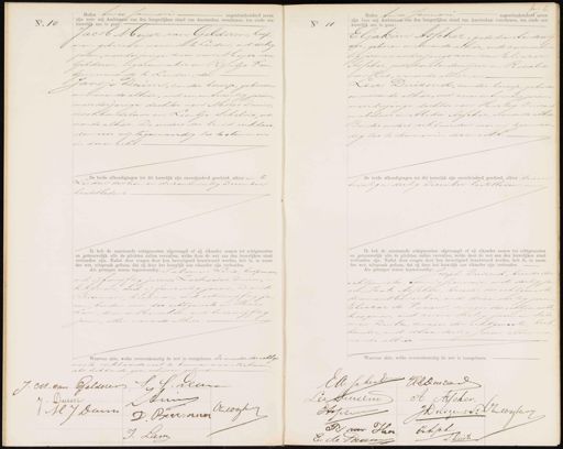 No. 10 Heden twee Januari negentienhonderd zeven zijn voor mij Ambtenaar van den burgerlijken stand van Amsterdam verschenen, ten einde een huwelijk aan te gaan Jacob Meyjer van Gelderen, koop 1 man, geboren en wonende te Leiden, ond dertig jaren, meerderjarige zoon van Meijer van Gelderen, sigarenmaker en Rijntje Fon zijn, wonende te Leiden, en Jansje Duim, zonder beroep, geboren en wonende alhier, oud een entwintig jaren, meerderjarige dochter van Mozes Duim, vischhandelaar en Leentje Schelvis, wo nende alhier. De ouders der bruid verklaar den voor mij tegenwoordig toe te stemmen in dezen echt. De beide afkondigingen tot dit huwelijk zijn onverhinderd geschied, alhier en te Leiden zestien en drie entwintig December laatstleden. Ik heb de aanstaande echtgenooten afgevraagd of zij elkander nemen tot echtgenooten en getrouwelijk alle de plichten zullen vervullen, welke door de wet aan den huwelijken staat verbonden zijn. Nadat deze vragen door hen bevestigend beantwoord werden, heb ik, in naam der wet, uitspraak gedaan, dat zij door het huwelijk aan elkander zijn verbonden. Als getuigen waren tegenwoordig: Salomon Levie, koopman oud vijfenvijftig jaren, Lacharias Duim, koopman, oud vijfenveertig jaren, David Bierman, koopman, oud achtenvijftig ja ren, beiden oom der echtgenoote en Baal Lam, diamantbewerker, oud twee envijftig jaren, allen wonende alhier Waarvan akte, welke overeenkomstig de wet is voorgelezen. De moeder der echtge noote verklaarde niet te kunnen naamteekenen No 11 Heden twee Januari negentienhonderd zeven zijn voor mij Ambtenaar van den burgerlijken stand van Amsterdam verschenen, ten einde een huwelijk aan te gaan EGakim Asscher, gods dienst onderw zer, geboren en wonende alhier, oud zeven entwi tig jaren, meerderjarige zoon van Eliazer Asscher, godsdienstonderwijzer en Rosalie van Hes, wonende alhier, en Lea Duizend, zonder beroep, geboren en wonende alhier, oud zevenentwintig jaren, meerderjarige dochter van Hartog Duizend makelaar en Alida Asscher, wonende alhier Bei der ouders verklaarden voor mij tegenwoor dig toe te stemmen in dezen echt- De beide afkondigingen tot dit huwelijk zijn onverhinderd geschied, alhier drie en twintig en dertig December laatstleden. Ik heb de aanstaande echtgenooten afgevraagd of zij elkander nemen tot echtgenooten en getrouwelijk alle de plichten zullen vervullen, welke door de wet aan den huwelijken staat verbonden zijn. Nadat deze vragen door hen bevestigend beantwoord werden, heb ik, in naam der wet, uitspraak gedaan, dat zij door het huwelijk aan elkander zijn verbonden. Als getuigen waren tegenwoordig. Joseph Duizend, broeder der echtgenoote, commissionnair, oud dertig Ja ren, Izak Asscher, broeder des echtgenoots, diamantbewerker, oud drieen dertig jaren Eleazar de Paauw, zwager des echtgenoots koopman, oud zevenendertig jaren en Salo mon Duitz, zwager der echtgenoote, boek houder, oud drieen dertig jaren, allen wo nende alhier Waarvan akte, welke overeenkomstig de wet is voorgelezen. als hebbende geen schrijven geleerd. J. MM. van Gelderer Sys,Le „ Luin J. Duim Vtn Wogten M J Duim D Prernun J. Lam Elleschert Heduurend Lea Kuizene A Asscher DDuizen S: Vanwolary Ctssiten J van Heer IAssche S. Duits E de Praum