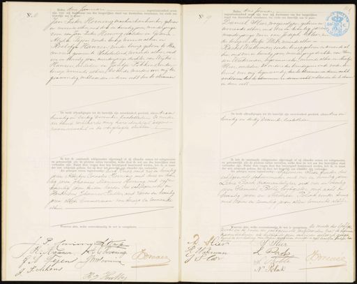 No. 18 Heden drie Januari nhonderd zeve zijn voor mij Ambtenaar van den burgerlijken stand van Amsterdam verschenen, ten einde een huwelijk aan te Gaan: Jan Pieter Hooning, machinebankwerker, geboren en wonende alhier oud drie en twintig jaren, meerderjarige zoon van Jan Pieter Hooning overleden en Gesina Alijda Tejen zonder beroep, wonende alhier en Roelofje Hanzen zonder beroep geboren te Heer ren veer gemeente Schoterland, wonende alhier, oud een en twintig jaren, meerderjarige dochter van Wijtze Hanzen, overleden en Jantje Fokkens, zonder beroep, wonende alhier De beide moeders, voor mij te genwoordig, verklaarden in dezen echt toe te stemmen. De beide afkondigingen tot dit huwelijk zijn onverhinderd geschied, alhier drie en twintig en Dertig December laatstleden. De moeder der bruid verklaarde mij hore idenliteit, wegens- nadmsverschil in de overgelegde stukken Ik heb de aanstaande echtgenooten afgevraagd of zij elkander nemen tot echtgenooten en getrouwelijk alle de plichten zullen vervullen, welke door de wet aan den huwelijken staat verbonden zijn. Nadat deze vragen door hen bevestigend beantwoord werden, heb ik, in naam der wet, uitspraak gedaan, dat zij door het huwelijk aan elkander zijn verbonden Als getuigen waren tegenwoordig: Dirk (nop oud zes en twintig jaren Albertus Cornelis Hooning, oud twee en twin„ tig jaren Johannes Marinus Hooning, oud vijf en twintig jaren beiden Roeder des echtgenoots en Hendricus Johannes Hutter oud zeven en twintig jaren allen timmerman van beroep en wonende alhier. Waarvan akte, welke overeenkomstig de wet is voorgelezen. No 19 Heden drie Januari negentienhonderd zeven zijn voor mij Ambtenaar van den burgerlijken stand van Amsterdam verschenen, ten einde een huwelijk aan te gaan: Daniel Slier roosjesslijper geboren en 39 wonende alhier oud drie en twintig jaren meerderjarige zoon van Joseph Slier, zon uro der beroep en Mietje Blitz, wonende alhier en Rachel Waterman, zonder beroep geboren en wonende al hier, oud vier en twintig jaren, meerderjarige dochter van Sam son Waterman, sigarenmaker, wonende alhier en slaatje Slier, overleden. De ouders des bruidegoms en de vader der bruid voor mij tegenwoordig, toe te stemmen in dezer echt verklaren toe te stemmen in dezen echt verklaarden toe te stemn in dezen echt. De beide afkondigingen tot dit huwelijk zijn onverhinderd geschied, alhier drie en twintig en dertig December laatstleden Ik heb de aanstaande echtgenooten afgevraagd of zij elkander nemen tot echtgenooten en getrouwelijk alle de plichten zullen vervullen, welke door de wet aan den huwelijken staat verbonden zijn. Nadat deze vragen door hen bevestigend beantwoord werden, heb ik, in naam der wet, uitspraak gedaan, dat zij door het huwelijk aan elkander zijn verbonden Als getuigen waren tegenwoordig: Salomon Sier, broeder des echtgenoots Schoenmaker, oud vier en twintig jaren, Levie Pach diamantslijper, oud vier en veertig jaren Samuel Bolle roodgieter oud acht en twintig jaren en Nathan Polak zonder beroep oud zeven en zeventig jaren, allen wonende alhier Waarvan akte, welke overeenkomstig de wet is voorgelezen. De moeder des Echtge¬ noofs en de vader der echtgenoote verklaarden niet te bunne naamteekenen als hebbende geen schrijven geleerd, gedge P Hoonig R. Krafo J. R. Hannen J E Keooning Brevel G A Tejen JMlooning J Pokkens H v Hutfe naamteekenen als hebbende geen schrijven geleerd, gedge keurd de doorhaling van dertien gezegeven woorden in regel twaalf en ertien van V. boven D: Heer I Slier R Waterman L. Pad I Ster Breces S. Bolle N Tolak