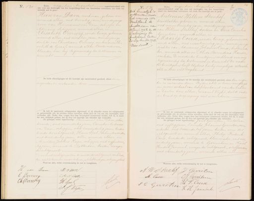 No. 530 Hede verent een g om utien Ausustus uegentenderded de zijn voor mij Ambtenaar van den burgerlijken stand van Amsterdam verschenen, ten einde een Hein van Dam, werkman, geboren en wonende alhier, oud twintig jaren, minderjarige zoon van Hermanus van Dam, schipper en Adriana Schippers, wonende alhier, en Elisabeth Overweg, zonder beroep, geboren en wonende alhier, oud zeventien jaren, minderjarige dochter van Christiaan Overweg, werkman en Eli„ sabeth de Graaf, wonende alhier. Beider ouders ver„ klaarden voor mij tegenwoordig toe te stemmen in dezen echt. De beide afkondigingen tot dit huwelijk zijn onverhinderd geschied, alhier den negenden en zestienden dezer Ik heb de aanstaande echtgenooten afgevraagd of zij elkander nemen tot echtgenooten en getrouwelijk alle de plichten zullen vervullen, welke door de wet aan den huwelijken staat verbonden zijn. Nadat deze vragen door hen bevestigend beantwoord werden, heb ik, in naam der wet, uitspraak gedaan, dat zij door het huwelijk aan elkander zijn verbonden. Als getuigen waren tegenwoordig: Hermanus van Dam, schui„ tevoerder, oud vierendertig jaren, Cornelis Antonius van Dam, schipper, oud twee endertig jaren, beiden broeder des echtgenoots, Harm Spel, schuitevoerder, oud drieëndertig jaren, allen wonende alhier en Arnoldus Jacobus Kaper, schipper, oud vijfentwin„ tig jaren, wonende te Rotterdam, beiden zwager des echtgenoots. Te ouders desechtgenootsen de moeder der echtgenoote, verklaar„ den niet te kunnen naamteekenen, als hebbende aanschrijven geleerd. Waarvan akte, welke overeenkomstig de wet is voorgelezen. Dit huwelijk is ontbonden door: het vonnis der Rechtbank te Amsterdam van: 10 Juni 1942 en de inschrijving te Amsterdam, heden: 24 September 1942 van soest. negentien Augustus negentienhonderd acht zijn voor mij Ambtenaar van den burgerlijken : stand van Amsterdam verschenen, ten einde éen huwelijk aan te gaan: Antonius Willem Steenhof broodbakker, geboren en wonende alhier „oud vierentwintig jaren, meerderjarige zoon ie van Willem Steerhof, koetsier en Sara Cornelia Gerritsen, wonende alhier, en Maartje Coerse, zonder beroep, geboren en wo nende alhier, oud zesentwintig jaren, meerderjarige dochter van Adrianus Johannes Coerse, kistenma„ ker, wonende alhier en Alida Berendina Hauser, overleden. De moeder des bruidegoms verklaarde voor mij tegenwoordig toe te stemmen in dezen echt. De vader des bruidegoms heeft blijkens hierbij overgelegde notaricele akte in dezen echt toegestemd. De beide afkondigingen tot dit huwelijk zijn onverhinderd geschied, alhier den negen den en zestienden dezer. Bij deze akte is tevens overgelegd een proces verbaal van tusschenkomst van den rechter in kanton twee alhier, waaruit blijkt, dat de vader der bruid op de oproeping niet is verschenen. Ik heb de aanstaande echtgenooten afgevraagd of zij elkander nemen tot echtgenooten en getrouwelijk alle de plichten zullen vervullen, welke door de wet aan den huwelijken staat verbonden zijn. Nadat deze vragen door hen bevestigend beantwoord werden, heb ik, in naam der wet, uitspraak gedaan, dat zij door het huwelijk aan elkander zijn verbonden Als getuigen waren tegenwoordig: Jacob Gerritsen, metselaar, oud vijftig jaren, Cornelis Johannes Gerritsen veem„ arbeider, oud tweeëndertig jaren, beiden oom des echtgenoots en wonende alhier, Philip Frederik Coerse, broeder der echtgenoote, kleermaker, oud vier„ endertig jaren, wonende te Gorinchem en Karel Hendrik Jannink, zwager der echtgenoote, stoffeerder, oud vierendertig jaren, wonende alhier. H van Deam D S. Pam E Overweg A A Dam Ju Ch Coverweg H Spel P L. Kaper AW Steenhef J Gerritden M. Coerte CJ Gorrisem sande Ph F: Coerse S C Gerriteer K.H. Jannink.