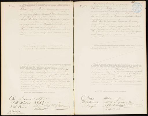 No. 783 mber negen oor mij Ambtenaar van den burgerlijken stand van Amsterdam verschenen, ten einde een huwelijk aan te gaan: Christiaan Böse, timmerman, geboren en wonende alhier, oud zes entwintig jaren, meerderjari „ge zoon van Johann Heinrich Böse, timmerman en Aaltje Valentijn, wonende alhier, en Antje Helena Martens, zonder beroep geboren en wonende alhier, oud vierentwintig jaren, meerderjarige dochter van Bartholomeus Martens scheepstimmerman en Antje Helena van der Reijden, wonende alhier. Beider ouders verklaar der voor mij tegenwoordig toe te stemmen in dezen echt. De beide afkondigingen tot dit huwelijk zijn onverhinderd geschied, alhier Zevenen „twintig October laatstleden en drie dezer. Ik heb de aanstaande echtgenooten afgevraagd of zij elkander nemen tot echtgenooten en getrouwelijk alle de plichten zullen vervullen, welke door de wet aan den huwelijken staat verbonden zijn. Nadat deze vragen door hen bevestigend beantwoord werden, heb ik, in naam der wet, uitspraak gedaan, dat zij door het huyelijk aan elkander zijn verbonden. Als getuigen waren tegenwoordig: Johann Heinrich Bose kantoorlooper, oud dertig jaren, Abraham Böse timmerman, oud negenentwintig jaren, beiden broe „der des echtgenoots, Karel Frederick Muijderman zwager der echtgenoote, postbeambte, oud vyfentwin tig jaren en Ernst Hendrik Lodewijk Knipper, kan „toorbediende, oud vijfentwintig Jaren, allen wonen „de alhier. De moeder der echtgenoote verklaarde niet te kunnen naamteekenen, als hebbende geen schriven ge „leerd. Waarvan akte, welke overeenkomstig de wet is voorgelezen. o. 784 1G eder zeven November negentienhonderd zeven zijn voor mij Ambtenaar van den burge :stand van Amsterdam verschenen, ten einde een huwelijk aan te gaan: Christiaan Berg, graveur, geboren en wonende alhier, oud tweeentwintig jaren, 201 meerderjarige zoon van Coenraad Berg, boekdrukker, wonende alhier en Willemina Agnetha Stuart, overleden, en Mathilda Catharina Hermina Henning, zonder beroep, geboren en wonende alhier, oud een „entwintig jaren, meerderjarige dochter van Edu „ard Henning en Maria Margaretha van der Vliet, beiden overleden. De vader des bruidegoms verklaarde voor mij tegenwoordig toe te stemmen in dezen echt. De beide afkondigingen tot dit huwelijk zijn onverhinderd geschied, alhier Zevenen „twintig October laatstleden en drie dezer: Ik heb de aanstaande echtgenooten afgevraagd of zij elkander nemen tot echtgenooten en getrouwelijk alle de plichten zullen vervullen, welke door de wet aan den huwelijken staat verbonden zijn. Nadat deze vragen door hen bevestigend beantwoord werden, heb ik, in naar der wet, uitspraak gedaan, dat zij door het huwelijk aan elkander zijn verbonden. Als getuigen waren tegenwoordig: Wiechger Kornelis Kramer zwager des echtgenoots, kantoorbediende, ondacht „en dertig Jaren, Willem Hendrik de Groot, graveur oud eenenzestig jaren, Wiechger Kornelis Kramer zonder beroep, oud achtenzestig jaren en Cornelis Mienes, koffiehuishouder, oud tweeenvyftig jaren, allen wonende alhier Waarvan akte, welke overeenkomstig de wet is voorgelezen. Chr Bose Gupon A. H. Martens. A. Böre RL Muijderua Preceee J H Bose JKh Huispen A valertijn ns J. Berg. WKramerJr WH. de Groot M: Hounin revel WK Kramel C. Berg C Miener