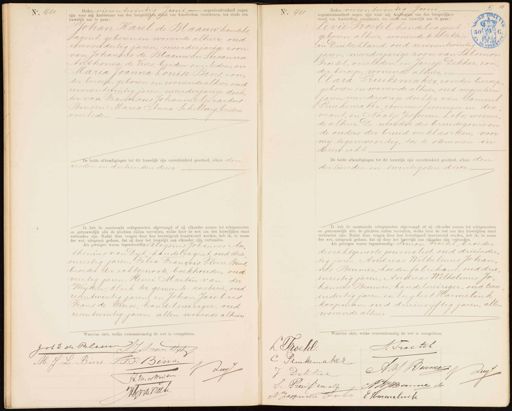 No. 410 Heden vierentwintig zijn voor mij Ambtenaar van den burgerlijken stand van Amsterdam verschenen, ten ide een huwelijk aan te gaan: Johan Karel de Blaauw, handels„ agent, geboren en wonende alhier oud zevenendertig jaren, meerderjarige zoon van Johannes de Blaauw en Susanna Anthonia de Vries, beiden overleden, en Maria Joanna Louise Bins, zon„ der beroep, geboren en wonende alhier, oud zevenentwintig jaren, meerderjarige doch„ ter van Franciscus Johannes Gérardus Bins en Maria Anna Schilling, beiden overleden. De beide atkondigingen tot dit huwelijk zijn onverbinderd geschied, alhier den zesden en dertienden dezer Ik heb de aanstaande echtgenooten afgevraagd of zij elkander nemen tot echtgenooten en getrouwelijk alle de plichten zullen vervullen, welke door de wet aan den huwelijken staat verbonden zijn. Nadat deze vragen door hen bevestigend beantwoord werden, heb ik, in naam der wet, uitspraak gedaan, dat zij door het huwelijk aan elkander zijn verbonden. Als getuigen waren tegenwoordig: Mloysius Johannes An thonius van Dijk handelsagent oud drie enzestig jaren, Felix François Pierre Bins, broeder der echtgenoote, boekhouder, oud veertig jaren, Henri Martin van der Weijden, klerk ter gemeente- secretarie, oud zesentwintig jaren, en Johan Jacobus Frans de Reese, handelsreiziger, oud zesentwintig jaren, allen wonende alhier Waarvan akte, welke overeenkomstig de wet is voorgelezen. de Belaauw J A van Vyf vierentwintig Juni negentienhonderd negen zijn voor mij Ambtenaar van den burgerlijken stand van Amsterdam verschenen, ten einde een huwelijk aan te gaan: Levie Troefel, handelsagent geboren alhier, wonende te Stettin in Duitschland, oud zevenentwintig jaren, meerderjarige zoon van Salomon Troetel, overleden, en Jansje Dekker, zon„ der beroep, wonende alhier, en Clara Truikemaker, zonder beroep geboren en wonende alhier, oud negentien jaren, minderjarige dochter van Samuel Pruikemaker, commissionnair in dia mant, en Naatje Geslurun Lobo, wonen de alhier. De moeder des bruidegoms en de ouders der bruid verklaarden, voor„ mij tegenwoordig, toe te stemmen in dezen echt. De beide afkondigingen tot dit huwelijk zijn onverhinderd geschied, alhier den dertienden en twintigsten dezer Ik heb de aanstaande echtgenooten afgevraagd of zij elkander nemen tot echtgenooten en getrouwelijk alle de plichten zullen vervullen, welke door de wet aan den huwelijken staat verbonden zijn: Nadat deze vragen door hen bevestigend beantwoord werden, heb ik, in naam der wet, uitspraak gedaan, dat zij door het huwelijk aan elkander zijn verbonden. Als getuigen waren tegenwoordig: Simon Boetel, broeder des echtgenoots, journalist, oud drieender tig jaren, Andreas Wilhelmus Johan„ nes Beumer, hoedenfabrikant, oud drie enzestig jaren, Andreas Wilhelmus Jo hannes Beumer, handelsreiziger, oud twee endertig jaren, en Engbert Harmelink koopman, oud drieenvijftig jaren, allen wonende alhier Wegiran ale, velke opereenkoudig de wel is voorgeleren Jvh K de Plaaem JJ A van Dyf A. J: L. Bins. F.P.P Bins. Duyt P: MorWeijlen WHdBulk S. Troetel L Proetel. C. Plinkemaker AMJ Bunnen Zuyt J Dekker