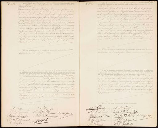 No. 402 egentienhond. drie en twintig zijn voor mij Ambtenaar van den burgerlijken stand van Amsterdam verschenen, ten einde een huwelijk aan te gaan Salomon Levie Knap, koopman, geboren in de voormalige gemeente Kralingen, thans gemeente Rot„ terdam, wonende alhier, oud acht en twintig jaren, meerderjarige zoon van Mozes Knap, koopman, en Geertruida Schenk, wonende te Rotterdam, en— Mathilda de Groot, zonder beroep, geboren en wonende alhier, oud een en twintig jaren, meerder„ jarige dochter van Benjamin de Groot, zonder be„ roep, en Eva Trijda, wonende alhier. De vader des bruidegoms en de ouders der bruid verklaarden, voor mij tegenwoordig, toe te stemmen in dezen echt. De moe„ der des bruidegoms en heeft, blijkens hierbij overgelegde aan thentieke akte, in dezen echt toegestemd. De beide afkondigingen tot dit huwelijk zijn onverhinderd geschied, alhier den dertienden en twintigsten dezer- Ik heb de aanstaande echtgenooten afgevraagd of zij elkander nemen tot echtgenooten en getrouwelijk alle de plichten zullen vervullen, welke door de wet aan den huwelijken staat verbonden zijn. Nadat deze vragen door hen bevestigend beantwoord werden, heb ik, in naam der wet, uitspraak gedaan, dat zij door het huwelijk aan elkander zijn verbonden Als getuigen waren tegenwoordig: Jacob Knap, broeder des echtgenoots, koopman, oud zeven en dertig jaren, wonende te Rotter„ dam, Louis Blijdenstijn, veekandelaar, oud negen en veertig jaren, Raphoel Beer Trijda, oom der echtgenoote, koopman„ oud vier en dertig jaren, en Ahram Wolf, zwager des echt ge„ noots, winkelbediende, oud een en dertig jaren, allen wo„ nende alhier. Goedgekeurd de doorhaling van een geschreven letter in den vijftienden regel van boven Waarve welke overeenkomstig de wet is. 403. en twintig Ju zijn voor mij Ambtenaar van den burgerlijken stand van Amsterdam verschenen, ten einde een huwelijk aan te gaan: Antoon Joseph Koenraad Grond, procura tiehouder, geboren te rijgelshoven, wonende alhier, oud zeven en twintig jaren, meerderjarige zoon van Kaspar Theodoor Grond, hoofd eener school„ en Anna Gertrud Eijdems, wonende te Heer, len, en Anna Maria Eugenie Agnes Prins, zon„ der beroep, geboren en wonende alhier, oud een en twintig jaren, meerderjarige dochter van Jacobus Prins, fabrikant, en Agnes Margaretha Ruijt, wo„ nende alhier. Beider ouders verklaarden, voor mij tegenwoordig, toe te stemmen in dezen echt.- De beide afkondigingen tot dit huwelijk zijn onverhinderd geschied, alhier den dertienden en twintigsten dezer Ik heb de aanstaande echtgenooten afgevraagd of zij elkander nemen tot echtgenooten en getrouwelijk alle de plichten zullen vervullen, welke door de wet aan den huwelijken staat verbonden zijn. Nadat deze vragen door hen bevestigend beantwoord werden, heb ik, in naam der wet, uitspraak gedaan, dat zij door het huwelijk aan elkander zijn verbonden. Als getuigen, waren tegenwoordig: Johannes Jacobus Petrus van der Kijden, zwager der echtgenoote, arts, oud zes en vijftig ja ren, Conrad Awick, manufacturier, oud vier en vijf„ tig jaren, Symon Borger, houthandelaar, oud veer„ tig jaren, allen wonende alhier, en Antoon Jozef Eijdems, oom des echtgenoots, molenaar, oud vier en vijf„ tig jaren, wonende te Kerkrade. Waarvan akte, welke overeenkomstig de wet is voorgelezen. J L Knop. D J de Groot Le Col denblgr V waferren RRPZ Aareraf Goef J de Groot ie Kryda DJ C. A M. Kuijt. W. Joh J J: van de Eyden A.M. E. As. Prins — Arrick Oanwakerr HEhGrond ABorgs A: G. Eijdems RP bidem