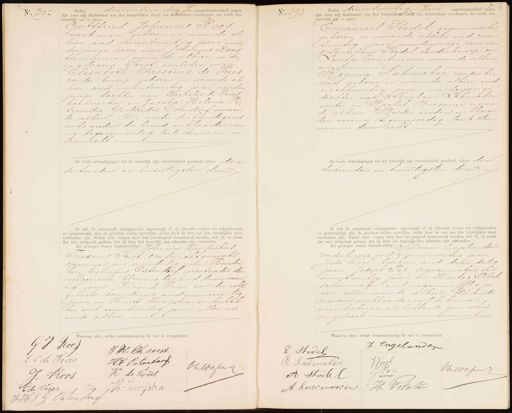 Ven nienen, ten Sind zijn voor mij Ambtenaar van den burgerls huwelijk aan te gaan: Gottfried Johannes Roos werkman geboren en wonende al„ hier, oud vierentwintig jaren, meer„ derjarige zoon van Johannes Roos timmerman, wonende alhier, en An„ na Maria Soest overleden, en nje Elisabeth Christina de Tries zonder beroep, geboren en wonende al hier, oud vierentwintig jaren meerder„ jarige dochter van Cornelis de Vries bootwerker en Jacoba Helena Te tronella Gertrudis Ostendorf, wonen de alhier. De vader des bruidegoms en de ouders der bruid verklaarden, voor mij tegenwoordig, toe te stemmen in zezen echt De beide afkondigingen tot dit huwelijk zijn onverhinderd geschied, alhier den dertienden en twintigsten dezer.- Ik heb de aanstaande echtgenooten afgevraagd of zij elkander nemen tot echtgenooten en getrouwelijk alle de plichten zullen vervullen, welke door de wet aan den huwelijken staat verbonden zijn. Nadat deze vragen door hen bevestigend beantwoord werden, heb ik, in naam der wet, uitspraak gedaan, dat zij door het huwelijk aan elkander zijn verbonden. Als getuigen waren tegenwoordig: Johannes Hendrikus Theodorus Soebt, oom des echtgenoots Opperman oud eenendertig jaren Hendri kus Egbertus Ostendorf grootvader der echtgenoote, kleermaker oud drieenzeven„ tig jaren, Klaas de Vries, oom der echt„ genoote, korendrager oud eenenzeventig jaren, en Huite Kooijstra, suikerbak„ ker, oud eenentwintig jaren, allen wo„ nende alhier drieentwint 5/10 zijn voor mij Ambtenaar van den burgerlijken stand van Amsterdam verschenen, ten einde, een huwelijk aan te gaan: Omanuel Stodel begarenmaker geboren en wonende alhier, oud zes en twintig jaren, meerderjarige zoon van Abraham Stodel, zonder beroep, en Leentje Zwartverwer, wonende alhier, en Degina Lakmaker, zonder be„ C roep geboren en wonende alhier, oud zes entwintig jaren, meerderjarige dochter van Abraham Lakmaker venter, en Pachel Beesemer, wonen„ de alhier. Beider ouders verklaar den, voormij tegenwoordig, toe te stem„ men in dezen echt De beide afkondigingen tot dit huwelijk zijn onverhinderd geschied, alhier den dertienden en twintigsten dezer Ik heb de aanstaande echtgenooten afgevraagd of zij elkander nemen tot echtgenooten en getrouwelijk alle de plichten zullen vervullen, welke door de wet aan den huwelijken staan verbonden zijn. Nadat deze vragen door hen bevestigend beantwoord werden, heb ik, in naam der wet, uitspraak gedaan, dat zij door het huwelijk aan elkander zijn verbonden. dde getuigen waren tegenwoordig: Salomon Engelander zonder beroep oud zevenenzeventig jaren Juda Kool barbier, oud drieëndertig jaren, Joseph Pop, sigarenmaker, oud vierentwintig jaren en Hartog Polak schoenmaker, oud negenenviftig ja„ ren, allen wonende alhier. De beide moeders verklaarden niet te kunnen naamteekenen, als hebbende geenschrij„ vengeleerd. Waarvan akte, welke overeenkomstig de wet is voorgelezen. Vaarvan akte, welke overeenkomstig de wet is voorgelezen. G Roog J H: Th Soest E C de Vries HE OMensorg Oolooker K de Vries J. Roos P Hb P G Ootensors J ooija de Vrier J Engelanden E. Stodel R. Lakmaker Varwoopen WJ: Jp A storkl H. Tolak A Lookwarser