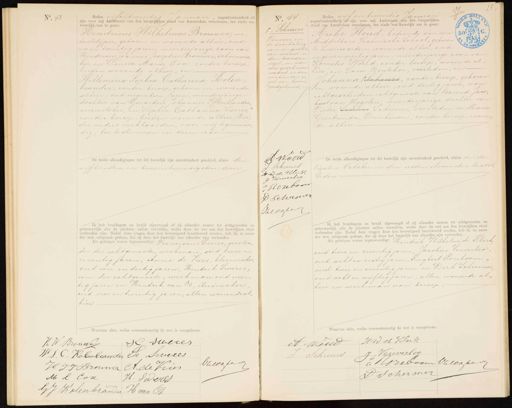 No. 43 leden v nari londerd elf zijn voor mij Ammbtenaar van den burgenIijken stand van Amsterdam verschenen, ten einde een huwelijk jaan te gaan: Hendricus Wilhelmus Brouwer, metaalslijper, geboren en wonende alhier, oud zes en twintig jaren, meerderjarige zoon van Hendricus Joannes Josephus Brouwer, schoenmaker, en Louisa Maria Cox, zonder beroep, beiden wonende alhier, en Willemina Sophia Catharina Kolenbrander, zonder beroep, geboren en wonende alhier, oud negentien jaren, minderjarige dochter van Gerardus Johannes Kolenbrander vuurstoker, en Sophia Catharina Sweres, zonder beroep, beiden wonende alhier Beider ouders verklaarden, voor mij tegenwoor dig, toe te stemmen in dezen echtDe beide afkondigingen tot dit huwelijk zijn onverhinderd geschied, alhier den vijftienden en tweeëntwintigsten dezer Ik heb bruidegom en bruid afgevraagd of zij elkander nemen tot echtgenooten en getrouwelijk alle de plichten zullen vervullen, welke door de wet aan den huwelijken staat verbonden zijn. Nadat deze vragen door hen bevestigend beantwoord werden, heb ik, in naam der wet, uitspraak gedaan, dat zij door het huwelijk aan elkander zijn verbonden. Als gebuigen waren tegenwoordig: Franciscus Sweres, grootader der echtgenoote, werkman, oud twee en zeventig jaren, Anne de Vries, kleermaker, oud een en dertig jaren, Hendrik Iweres, oom der echtgenoote, werkman oud vier. tig jaren en Hendrik van Os, Huimaker oud vier en twintig jaren, allen wonende alhier. No. 44 „ Schreurs Renvooi en de doorhaling van een geschhreven woord in den tienden regel, en van een geschreven woord in den veertienden regel van boven, goedgekeurd, A Woord J Schreurs H ad de Klerk 7 Venverloo Rozeboor D Schrrmer Oalogheng len twintig Januari negentienhonderd eff zijn voor mij Ambtenaar van den burgerlijken stand van Amsterdam verschenen, ten einde een huwelijk aan te gaan: Auke Houd, bediende aan eene Middelbare Technische School, geboren te Leeuwarden, wonende alhier, oud negenenveertig jaren, meerderjarige zoon van Kornelis Woud, zonder beroep, wonende alhier, en Sara Bontekoe, overleden, en Johanna /Scheurs, zonder beroep, geboren en wonende alhier, oud dertig jaren, van echtgescheiden echtgenoote van Barend Jacobus van Uggelen, meerderjarige dochter van Pieter Scheurs Schreurs, overleden en Maria Geertruida Brinkman, zonder beroep, wonen de alhier De beide afkondigingen tot dit huwelijk zijn onverhinderd geschied, alhier den der tigsten October en den zesden November laatst, leden. Ik heb bruidegom en bruid afgevraagd of zij elkander nemen tot echtgenooten en getrouwelijk alle de plichten zullen vervullen, welke door de wet aan den huwelijken staat verbonden zijn. Nadat deze vragen door hen bevestigend beantwoord werden, heb ik, in naam der wet, uitspraak gedaan, dat zij door het huwelijk aan elkander zijn verbonden. Als getuigen waren tegenwoordig: Hendrik Wilhelm de Klerk oud twee en zeventig jaren, Jacobus Venverloo oud acht en zestig jaren, Engbert Rozeboom oud twee en zeventig jaren en Dirk Schermer, oud acht en vijftig jaren, allen wonende alhier en werkman van beroep Waarvan akte, welke overeenkomstig de wet is voorgelezen. HW Brouwer K Sweres W J C: Kobubeanden K Suures buwglan H PJ Brouna A. de Kries M L Con H: SWerls G J Kolenbramder H van Os H v de Kleek A Woud JVenverloo Schreurs Cozebooen Oaloghaven D Schermer