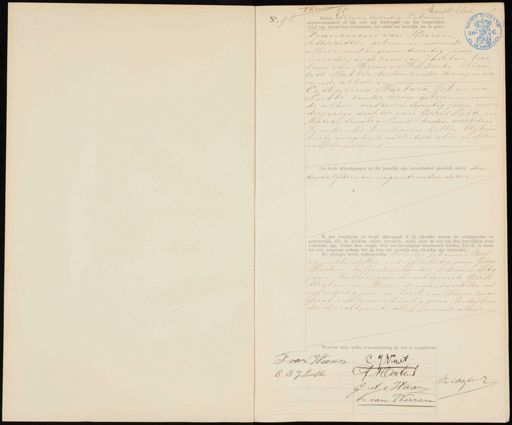 No. 98 V 1 heeld Eerste blad Heden drie en twintig Februari negentienhonderd elf zijn voor mij Ambtenaar van den burgerlijken stand van Amsterdam verschenen, ten einde een huwelijk aan te gaan: Franciscus van Weeren letterzetter, geboren en wonende alhier, oud negen en twintig jaren meerderjarige zoon van Jacobus Nico„ laas van Heeren en Hendrika Elisa, beth Bakker, beiden zonder beroep en wo„ nende alhier, en Catharina Barbara Johanna Lubbe, zonder beroep, geboren en wonen„ de alhier, oud zes en twintig jaren, meer„ derjarige dochter van Gerrit Lubbe, en Maria Amalia Lund, beiden overleden De ouders des bruidegoms hebben, blijkens hierbij overgelegde authentieke akte, in dezen echt toegestemd De beide afkondigingen tot dit huwelijk zijn onverhinderd geschied, alhier den twaalfden en negentienden dezer Ik heb bruidegom en bruid afgevraagd of zij elkander nemen tot echtgenooten en getrouwelijk alle de plichten zullen vervullen, welke door de wet aan den huwelijken staat verbonden zijn. Nadat deze vragen door hen bevestigend beantwoord werden, heb ik, in naam der wet, uitspraak gedaan, dat zij door het huwelijk aan elkander zijn verbonden. Als getuigen waren tegenwoordig: Cornelis Johannes Volt, rijwielhersteller, oud vijf en dertig jaren, George Martens koffiehuishouder oud een en dertig jaren, beiden zwager der echtgenoote, Gerrit Abraham van Weeren, diamantversteller, oud vijf en dertig jaren en Karel van Weeren, zinco graaf, oud zeven en twintig jaren, beiden broe„ der des echtgenoots, allen wonende alhier. 2 1 F van Joeeren C. Wart S 2 J AOsten C B J Leubbe OZ Wyker GA. v Heeren K van Weeren