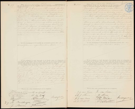 No. 99 Heden drie en twintig Februari negentienhonderd ol zijn voor mij Ambtenaar van den burgerlijken stand van Amsterdam verschenen, ten einde een huwelijk aan te gaan Jacob Johannes Benard, kantoor bediende, geboren en wonende alhier, oud acht en twintig jaren, meerderjarige zoon van Jan Benard en Emilie Josephine Hazianne Barkhuijsen, beiden zonder beroep en wonende alhier, en Cornelia Margaretha Boerel, zonder beroep, geboren en wonende alhier, oud zeven en twintig jaren, meerderjarige dochter van Johannes Boeree, letterzetter, en Mar„ grietha de Graaf, zonder beroep, beiden wonende alhier Beider ouders verklaarden voor mij tegenwoordig, toe te stemmen in dezen echt. De beide afkondigingen tot dit huwelijk zijn onverhinderd geschied, alhier den twaalfden en negentienden dezer Ik heb bruidegom en bruid afgevraagd of zij elkander nemen tot echtgenooten en getrouwelijk alle de plichten zullen vervullen, welke door de wet aan den huwelijken staat verbonden zijn. Nadat deze vragen door hen bevestigend beantwoord werden, heb ik, in naam der wet, uitspraak gedaan, dat zij door het huwelijk aan elkander zijn verbonden. Als getuigen waren tegenwoordig: Wilhelmus de Graaff, groot vader der echtgenoote, zonder beroep, oud zes en zeventig jaren, Hendrik Roestner huisschilder, oud veertig jaren, beiden wo nende te Haarlem, Hendrik Johannes Gijsbertus Benard, broeder des echtgenoots electricien, oud vier en twintig jaren en Jo hannes Boeree broeder der echtgenoote boekbinder, oud twee en twintig jaren, bei den wonende alhier. tereenkomstig de wet is voorgelezen. No. 100 Heden drie en twintig Februari negentienhonderd elf zijn voor mij Ambtenaar van den burgerlijken: stand van Amsterdam verschenen, ten einde een huwelijk aan te gaan: Jacobus Gerardus van Veen werkman, geboren en wonende alhier, oud vier en twintig jaren meerderjarige zoon van Jacobus Gerardus van Veen stalknecht, wonende alhier, en Cornelia Maria van Lindonk, overleden en Margaretha Geertruida Prins, zonder beroep, geboren en wonende alhier, oud vier en twintig jaren, meerderjarige doch ter van Gerardus Cornelis Prins werkman en Anna Hendrina Steffens, zonder beroep. beiden wonende alhier. De vader des bruidegoms en de moeder der bruid verklaarden, voor mij tegen woordig, toe te stemmen in dezen echt De vader der bruid- heeft, blijkens hierbij overgelegde authentie„ ke akte, in dezen echt toegestemd De beide afkondigingen tot dit huwelijk zijn onverhinderd geschied, alhier den twaalfden en negentienden dezer Ik heb bruidegom en bruid afgevraagd of zij elkander nemen tot echtgenooten en getrouwelijk alle de plichten zullen vervullen, welke door de wet aan den huwelijken staat verbonden zijn. Nadat deze vragen door hen bevestigend beantwoord werden, heb ik, in naam der wet, uitspraak gedaan, dat zij door het huwelijk aan elkander zijn verbonden. Als getuigen waren tegenwoordig: Cornelis van Veen, broe der des echtgenoots, tramconducteur, oud dertig jaren, Jan Prins, broeder der echtge noote veemarbeider, oud twee en dertig jaren Petrus Cornelis Wouters arbeider oud drie en veertig jaren en Frederik Eduard Martens, expediteur, oud veertig jaren, bei den zwager der echtgenoote allen wonende alhier. Waarvan akte, welke overeenkomstig de wet is voorge JBeuard M de Graaff Me Boerie W O Em tZWZlade Benar HKoeshier E J M Barkhuysen Hienar JBaerie J. Roelee J G van Veen C. van Veer J. Rrins M G Prins Gd D bewaaaer J. G. van Veer J.C. Wouteis. A H Hefser P. E Mbartens