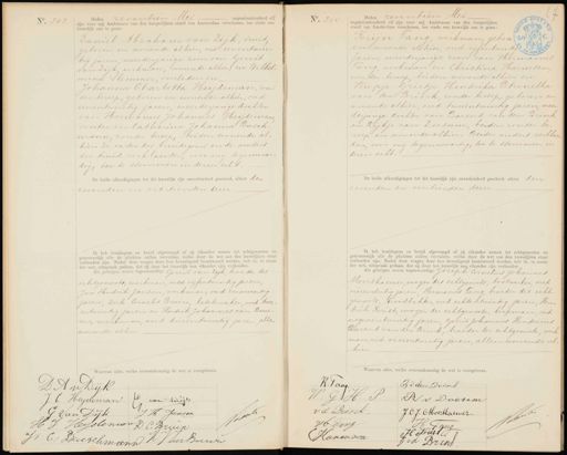 No. 303 Heden zeventien Mei negentienhonderd el zijn voor mij Ambtenaar van den burgerlijken stand van Amsterdam verschenen, ten einde een huwelijk aan te gaan: Daniel Abraham van Dijk, smid geboren en wonende alhier, oud eenentwin- tig jaren, meerderjarige zoon van Gerrit van Dijk werkman, wonende alhier, en Wilhel- mina Slemmer, overleden en Johanna Charlotta Heijdeman, zon„ der beroep, geboren en wonende alhier, oud eenentwintig jaren, meerderjarige dochter van Hermanus Johannes Heijdeman, venter en Catharina Johanna Busch. mann, zonder beroep, beiden wonende al- hier. De vader des bruidegoms en de ouders der bruid verklaarden, voor mij tegenwoor dig, toe te stemmen in dezen echt- De beide afkondigingen tot dit huwelijk zijn onverhinderd geschied, alhier den zevenden en veertienden dezer. Ik heb bruidegom en bruid afgevraagd of zij elkander nemen tot echtgenooten en getrouwelijk alle de plichten zullen vervullen, welke door de wet aan den huwelijken staat verbonden zijn. Nadat deze vragen door hen bevestigend beantwoord werden, heb ik, in naam der wet, uitspraak gedaan, dat zij door het huwelijk aan elkander zijn verbonden. Als getuigen waren tegenwoordig: Gerrit van Dijk, hoeder des echtgenoots, werkman, oud vijfentwintig jaren, Jan Hendrik Jansen, werkman, oud eenenveertig jaren Dirk Cornelis Bruin, ketelmaker oud twee entwintig jaren en Hendrik Johannes van Buu„ ren, werkman, oud drieëntwintig jaren, allen wonende alhier No. 304 Heden zeventien Mei negentienhonderd elf zijn voor mij Ambtenaar van den burgerlijken stand van Amsterdam verschenen, ten einde een huwelijk aan te gaan: Krijn Sang werkman, geboren ) 30 en wonende alhier, oud vijfentwintig jaren, meerderjarige zoon van Hermanus Tang, werkman en Christina Harmsen, zonder beroep beiden wonende alhier en Wiepje Grietje Hendrika Petronella van den Brink zonder beroep, geboren en wonende alhier, oud tweeëntwintig jaren, meer derjarige dochter van Barend van den Brink en Rijkje van Doesum, beiden zonder be- roep en wonende alhier. Beider ouders verklaar den, voor mij tegenwoordig, toe te stemmen in dezen echt. De beide afkondigingen tot dit huwelijk zijn onverhinderd geschied, alhier den zevenden en veertienden dezer Ik heb bruidegom en bruid afgevraagd of zij elkander nemen tot echtgenooten en getrouwelijk alle de plichten zullen vervullen, welke door de wet aan den huwelijken staat verbonden zijn. Nadat deze vragen door hen bevestigend beantwoord werden, heb ik, in naam der wet, uitspraak gedaan, dat zij door het huwelijk aan elkander zijn verbonden. Als gebuigen waren tegenwoordig: Joseph Cornelius Johannes Moorthalmer, zwager des echtgenoots, bootwerker, oud vierendertig jaren Hermanus Lang, broeder des echt- genoots, broodbakker, oud achtentwintig jaren, Hen- brik Krist, zwager der echtgenoote, koopman, oud negenentwintig jaren, Gerrit Johannes Hendricus Barend van den Brink, broeder der echtgenoote, werk man, oud vierentwintig jaren, allen wonende al- hier. Waarvan akte, welke overeenkomstig de wet is voorgelezen. D. A v Dijk J. C. HeydemanCo van wijz 9 Jb C Van Dijk J H Jansen H J Heydemard P C Bruin H E/ Dieschmann P Van Beur K: Taar B d den Brinh G:VH: P R v Doesem vd Bunk f66 J.C.J. Moortlaemer H Dang tang H KustG Hanmderi G vd. Brink