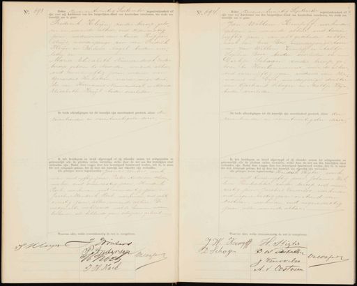 No. 693 Heden zevenentwintig September negentienhonderd elf zijn voor mij Ambtenaar van den burgerlijken stand van Amsterdam verschenen, ten einde een huwelijk aan te gaan: Frederik Kleijn zonder beroep, gebo- ren en wonende alhier, oud zesenzestig jaren weduwnaar van Anna Kipper sluijs, meerderjarige zoon van Fredrik Kleijn en Barbara Nagel, beiden over leden en Maria Elisabeth Nieuwendaal zonder beroep, geboren te Naarden, wonende alhier oud zevenenvyftig jaren, weduwe van Gerardus Haksteen, meerderjarige doch„ ter van Hermanus Nieuwendaal en Maria Elisabeth Kruijt, beiden overleden. De beide afkondigingen tot dit huwelijk zijn onverhinderd geschied, alhier den zeventienden en vierentwintigsten dezer, Ik heb bruidegom en bruid afgevraagd of zij elkander nemen tot echtgenooten en getrouwelijk alle de plichten zullen vervullen, welke door de wet aan den huwelijken staat verbonden zijn. Nadat deze vragen door hen bevestigend beantwoord werden, heb ik, in naam der wet, uitspraak gedaan, dat zij door het huwelijk aan elkander zijn verbonden. Als getuigen waren tegenwoordig: Joannes Winters, werk man, oud vijftig cjaren, Pieter Andersen, schoen maker, oud drieenzestig jaren, Hendrik Koch, werkman, oud vierendertig jaren en Jacobus Hendrik Koch, werkman, oud acht enzestig jaren, allen wonende alhier. De echtgenoote verklaarde niet te kunnen naam teekenen, als hebbende geen schrijven geleerd. Waarvan akte, welke overeenkomstig de wet is voorgelezen. No. 694 Heden zevenentwintig September hegen zijn voor mij Ambtenaar van den burgerlijken tand van Amsterdam verschenen, ten einde een huwelijk aan te gaan: Jan Willem Kempff, werkman geboren en wonende alhier oud tweeen vyftig jaren, van echt gescheiden echtge noot van Eva Bos, meerderjarige zoon van Jan Willem Kempff en Aaltje Sophia Boer, beiden overleden en Dirkje Schagen, zonder beroep, ge„ boren te Haarlemmermeer, wonende alhier oud vierenvijftig jaren weduwe van Her manus van Dijk meerderjarige dochter van Gerbrand Schagen en Neeltje Klijn beiden overleden. De beide afkondigingen tot dit huwelijk zijn onverhinderd geschied, alhier den zeventienden en vierentwintigsten dezer„ Ik heb bruidegom en bruid afgevraagd of zij elkander nemen tot echtgenooten en getrouwelijk alle de plichten zullen vervullen, welke door de wet aan den huwelijken staat verbonden zijn. Nadat deze vragen door hen bevestigend beantwoord worden, heb ik, in naam der wet, uitspraak gedaan, dat zij door het huwelijk aan elkander zijn verbonden Als getuigen waren tegenwoordig: Hendrik Stigter werk man, oud tweeënvijftig jaren, Johannes Wil„ lem Panbakker, zonder beroep, oud vieren zestig jaren, Jacobus Venverloo, werkman oud negenenzestig jaren en Arend van Oostveen, werkman, oud negenenzestig jaren, allen wonende alhier. J Wnzers 7 57 Kleyn dersen vawoolen 1 Koch J H: Hach stig de wet is voorgelezen. J:W: Kempt H. Stigter D Schagen D W Pubakken valooper J Venverloo A. V Oostveen