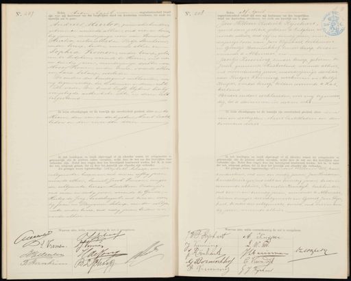 il negentienhonderd twaalf Heden tien zijn voor mij Ambtenaar van den burgerlijken stand van Amsterdam verschenen, ten einde een huwelijk aan te gaan: Andries Meerloo, procuratiehouder, geboren en wonende alhier, oud vier en twin„ tig jaren, meerderjarige zoon van Leonardus Heerloo, violoncellist en Betje Sternherm, zonder beroep, beiden wonende alhier en- Sophia Vromen, zonder beroep, gebo„ ren te Zutphen, wonende te Hoorn, oud vier en twintig jaren, meerderjarige dochter van Moees Vromen, zonder beroep, wonende alhier en Sara Schaap, overleden De ouders des bruidegoms verklaarden, voor mij tegenwoordig, toe te stemmen in dezen echt„ De vader der bruid heeft, blijkens hierbij overgelegde authentieke akte, in dezen echt toegestemd. De beide afkondigingen tot dit huwelijk zijn onverbinderd geschied, alhier en te Hoorn, den een en dertigsten Maart laatst„ leden en den zevenden dezer. Ik heb bruidegom en bruid afgevraagd of zij elkander nemen tot echtgenooten en getrouwelijk alle de plichten zullen vervullen, welke door de wet aan den huwelijken staat verbonden zijn. Nadat deze vragen door hen bevestigend beantwoord werden, heb ik, in naam der wet, uitspraak gedaan, dat zij door het huwelijk aan elkander zijn verbonden. Als getuigen waren tegenwoordig: Raphael schaap, oom der echtgenoote, koopman, oud drie en vijftig jaren. wonende alhier; tamwel Jacob Vroman, zwager der echtgenoote, leeraar Middelbaar- Onderwijs; oud zeven en dertig jaren, wonende te Gouda; Hartog de Jong, handelsagent, oud twee en veer„ tig jaren en Benjamin schaap, som der echtge„ noote, zonder beroep, oud zestig jaren, beiden wo„ nende alhier. No. 208 Heden elf April negentienhonderd twaalf zijn voor mij Ambtenaar van den burgerlijken stand van Amsterdam verschenen, ten einde een huwelijk aan te gaan: Jan Willem Frederik Rijnhart, agent van politie, geboren te Zutphen, wo- nende alhier, oud vijf en twintig jaren, meer„ derjarige zoon van Jan Rijnhart, boekhouder en Gerritje Borninkhof, zonder beroep, beiden wonende te Alkmaar, en Jantje Reuning zonder beroep, geboren te Joure, gemeente Haskerland wonende alhier oud vierentwintig jaren, meerderjarige dochter van Rutger Renning, werkman en Aaltje Kuiper, zonder beroep, beiden wonende te Has herland Beider ouders verklaarden, voor mij tegenwoor„ dig, toe te stemmen in dezen echt. De beide afkondigingen tot dit huwelijk zijn onverhinderd geschied, alhier den een en dertigsten Maart laatstleden en den zevenden dezer Ik heb bruidegom en bruid afgevraagd of zij elkander nemen tot echtgenooten en getrouwelijk alle de plichten zullen vervullen, welke door de wet aan den huwelijken staan verbonden zijn. Nadat deze vragen door hen bevestigend beantwoord werden, heb ik, in naam der wet, uitspraak gedaan, dat zij door het huwelijk aan elkander zijn verbonden. Als getuigen waren tegenwoordig: Leendert Willem Pol, tram conducteur, oud een en veertig jaren, Jan Huisman handelsreiziger, oud acht en twintig jaren, beiden wonende alhier, Cornelis Kwadijk, boekbinder oud zeven en twintig jaren wonende te Alkmaar beiden zwager des echtgenoots en Garrit Jan Rijn hart, broeder des echtgenoots, smid, oud vier en twin tig jaren, wonende alhier