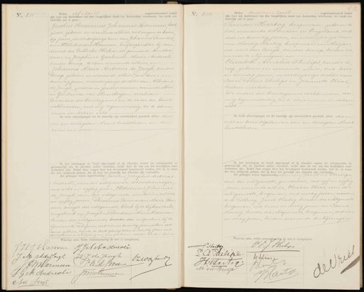 No. 211 Heden elf April negentienhonderd twaal zijn voor mij Ambtenaar van den burgerlijken stand van Amsterdam verschenen, ten einde een huwelijk aan te gaan: Jacobus Hermanus Johannes Harmsen lood„ gieter, geboren en wonende alhier, oud negen en twin tig jaren meerderjarige zoon van Johannes Francis cus Willebrordus Harmsen, hoofdopzichter bij den dienst der Publieke Werken der gemeente Amster dam en Josephine Geertruida Maria Andreoli zonder beroep, beiden wonende alhier, en Johanna Maria Antonia de Jongh, zonder beroep, geboren en wonende alhier, oud twee en twintig jaren, meerderjarige dochter van Albertus de Jongh, grossier in grutterswaren, wonende alhier en Geertruida van Hensbergen, overleden De ouders des bruidegoms en de vader der bruid verklaarden, voor mij tegenwoordig, toe te stem„ men in dezen echt. De beide afkondigingen tot dit huwelijk zijn onverhinderd geschied, alhier den een en dertigsten Maart laatstleden en den zevenden dezer Ik heb bruidegom en bruid afgevraagd of zij elkander nemen tot echtgenooten en getrouwelijk alle de plichten zullen vervullen, welke door de wet aan den huwelijken staat verbonden zijn. Nadat deze vragen door hen bevestigend beantwoord werden, heb ik, in naam der wet, uitspraak gedaan, dat zij door het huwelijk aan elkander zijn verbonden. Als gebuigen waren tegenwoordig: Jacobus Jozephus Andreas- Andreoli, oom des echtgenoots schoorsteenveger„ oud acht en vijftig jaren, Wilhelmus Johannes de Jongh, oom der echtgenoote, winkelier, oud vier en vijftig jaren Theodorus Bernardus Marie Bon sen, zwager des echtgenoots, klerk bij de Rijksverzeke ringsbank en Josephus Theodorus Marie Harmsen broeder des echtgenoots, broeder dis inspecteur bij de Gemeente Telefoon, oud vier en twintig jaren, allen wo nende alhier, zijnde de derde getuige zeven en twintig jaren oud Goedgekeurd de doorhaling van twee geschreven woorden in den drie en dertigsten regel van boven Waarvan akte, welke overeenkomstig de wet is voorgelezen. NNo. 212 Heden zestien April negentienhonderd twin„ zijn voor mij Ambtenaar van den burgerlijken stand van Amsterdam verschenen, ten einde een huwelijk aan te gaan: Simon Hartog, koopman, geboren te oss, wonende te Londen in Engeland, oud drie en twintig jaren, meerderjarige zoon van Hartog Hartog, koopman en Marjan na van den Bergh, zonder beroep, beiden wo nende te Nijmegen, en Elisabeth Amalia Philips, zonder be roep, geboren en wonende alhier, oud twee en twintig jaren, meerderjarige dochter van Isaac Tobias Philips en Jeannette Elias, beiden overleden De ouders des bruidegoms verklaarden, voor mij tegenwoordig, toe te stemmen in dezen echt De beide afkondigingen tot dit huwelijk zijn onverbinderd geschied, alhier den vier en twintigsten en een en dertigsten Maart laatstleden Ik heb bruidegom en bruid afgevraagd of zij elkander nemen tot echtgenooten en getrouwelijk alle de plichten zullen vervullen, welke door de wet aan den huwelijken staan verbonden zijn. Nadat deze vragen door hen bevestigend beantwoord werden, heb ik, in naam der wet, uitspraak gedaan, dat zij door het huwelijk aan elkander zijn verbonden. Als getuigen waren tegenwoordig: Simon Jacobus Philips oom der echtgenoote, geneesheer, oud vijf en vijftig jaren, wonende alhier bleazar Elias oom der echtgenoote, koopman, oud veertig jaren wonen de te Tilburg, Jacob Hartog, broeder des echtgenoots koopman, oud zeven en dertig jaren en Isaac Hartog, broeder des echtgenoots, koopman, oud vier en dertig jaren, beiden wonende te Nijmegen Waarvan akte, welke overeenkomstig de wet is voorgelezen. J:H J Harmen J J A Andnwver W.J. de Jongh. J. M. A. de Jongt JJWHarman JB. M Bouder Zloate v/ J. G. M. Andreele JJstannen A:d Jonst D.F J: Vhilips C Starten. LA. Brilepe Whliari Wo HVartog BH O M vd Buyn Jaals