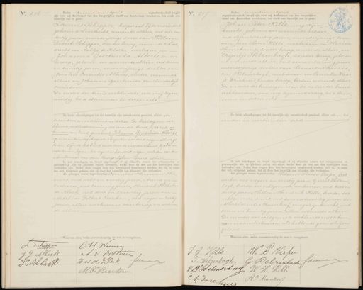 No. 216 Heden zeventien April negentienhonderd twaalf zijn voor mij Ambtenaar van den burgerlijken stand van Amsterdam verschenen, ten einde eén huwelijk aan te gaan: Lourens Schipper, korporaal bij de mariniers geboren te Loosdrecht wonende alhier oud vier en dertig jaren, meerderjarige zoon van Willem Fredrik Schipper zonder beroep, wonende te Loos drecht en Aaltje te Kloeze overleden en Johanna Geertruida Alberts zonder beroep, geboren en wonende alhier, oud zeven en twintig jaren, meerderjarige dochter van Jacobus Cornelis Alberts venter, wonende alhier en Johanna Geertruida van Linderdijk overleden.— De vader der bruid verklaarde voor mij tegen woordig, toe te stemmen in dezen echt- De beide afkondigingen tot dit huwelijk zijn onverhinderd geschied, alhier den zevenden en veertienden dezer De bruidegom ver klaarde met toestemming der moeder-bruid, by deze te er kennen een kind, genaamd: Johanna Geertruida Alberts op vierentwintig Augustus negentienhonderd negen alhier ge boren, zijnde dit kind reeds door de moeder erkend, bij akte in dato zeven September negentienhonderd negen verleden voor den Ambtenaar van den Burgerlijken Stand, alhier Ik heb bruidegom en bruid afgevraagd of zij elkander nemen tot echtgenooten en getrouwelijk alle de plichten zullen vervullen, welke door de wet aan den huwelijken staat- verbonden zijn. Nadat deze vragen door hen bevestigend beantwoord werden, heb ik, in naam der wet, uitspraak gedaan, dat zij door het huwelijk aan elkander zijn verbonden Als getuigen waren tegenwoordig: Cornelis Herman Her nars, oud acht en veertig jaren, Arend van Oostveen, oud zeventig jaren, Hendrik Wilhelm de Klerk oud drie en zeventig jaren en Melchior Folkert Beuken, oud negen en zestig jaren, allen werkman van beroep en wonen de alhier. NNo. 217 Heden zeventien April negentienhonderd twaalf zijn voor mij Ambtenaar van den burgerlijken stand van Amsterdam verschenen, ten einde een huwelijk aan te gaan: Johan Peter Kille magazyn, knecht, geboren en wonende alhier.- oud vijfentwintig jaren, meerderjarige zoon van Jan Pieter Kille overleden en Hazina Hienekamp zonder beroep wonende alhier en Fruntje Welzenbagh zonder beroep, geboren en wonende alhier, oud eenentwintig jaren, meerderjarige dochter van Leonardus Francis cus Welzenbagh, werkman en Cornelia Klaas Je Driehuis, zonder beroep, beiden wonende alhier De moeder des bruidegoms en de ouders der bruid verklaarden, voor mij tegenwoordig, toe te stem men in dezen echt De beide afkondigingen tot dit huwelijk zijn onverhinderd geschied, alhier den ze venden en veertienden dezer Ik heb bruidegom en bruid afgevraagd of zij elkander nemen tot echtgenooten en getrouwelijk alle de plichten zullen vervullen, welke door de wet aan den huwelijken staat verbonden zijn. Nadat deze vragen door hen bevestigend beantwoord werden, heb ik, in naam der wet, uitspraak gedaan, dat zij door het huwelijk aan elkander zijn verbonden. Als getuigen waren tegenwoordig: Willem Pieter Visser boot werker, oud negen en veertig jaren, Gerrit Welzen bagh, broeder der echtgenoote, werkman, oud twee en dertig jaren, Willem Hendrik Kille broeder des echtgenoots, smid, oud twee en twintig jaren en Albert Cornelis Rumkorf, magazijnknecht, oud zeven en twintig jaren, allen wonende alhier De moeder des echtgenoots verklaarde niet te kun nen naamteekenen, als hebbende geen schrijven geleerd Waarvan akte, welke overeenkomstig de wet is voorgelezen. L. Schipper C.H. Weenar A. V Oostveen J. G. Alberts HW de Klerk facrenbnn H Albert M F Beuken J: P. Kille W: I Nisker G. Welzerbagt Jacrenaar P: Welzenbagh. D Welmersteug WH. Kille Drie hi 12 H.C Kumkort