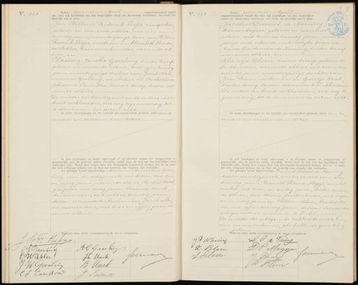 No. 222 Heden zeventien April negentienhonderd twaal zijn voor mij Ambtenaar van den burgerlijken stand van Amsterdam verschenen, ten einde een huwelijk aan te gaan: Jan Willem Frederik Visser, aanspreker geboren en wonende alhier, oud vier en twintig jaren meerderjarige zoon van Willem Frederik Visser overleden en Elisabeth Hendri ca Ichler, kamerverhuurster wonende al hier en Clasina Jacoba Geerling, zonder beroep geboren en wonende alhier oud vijf en twintig jaren, meerderjarige dochter van Jacob Her„ manus Geerling, winkelier en Catharina Johanna Camstra, zonder beroep, beiden wo nende alhier. De moeder des bruidegoms en de ouders der bruid verklaarden, voor mij tegenwoordig, toe te stemmen in dezen echt De beide afkondigingen tot dit huwelijk zijn onverhinderd geschied, alhier den ze venden en veertienden dezer Ik heb bruidegom en bruid afgevraagd of zij elkander nemen tot echtgenooten en getrouwelijk alle de plichten zullen vervullen, welke door de wet aan den huwelijken staat verbonden zijn. Nadat deze vragen door hen bevestigend beantwoord werden, heb ik, in naam der wet, uitspraak gedaan, dat zij door het huwelijk aan elkander zijn verbonden. Als getuigen waren tegenwoordig: Adrianus Ooerardus Geer ling, oom der echtgenoote winkelier, oud drie en vijftig jaren wonende alhier, Hendrik Anck gassister, oud dertig jaren, Barend Unck tuinman, oud acht en twintig jaren beiden wonende te Arnhem en Jacobus Lei ne, assuradeur, oud twee en vijftig jaren, wo nende alhier No. 223 Heden zeventien April negentienhonderd twaalf zijn voor mij Ambtenaar van den burgerlijken stand van Amsterdam verschenen, ten einde een huwelijk aan te gaan: Jacobus Daniel de Koning, 50. kraandryver, geboren en wonende alhier, oud twee en twintig jaren, meerder jarige niet erkende natuurlijke zoon van Anna Geertruida de Koning, zonder beroep wonende alhier, en Klaasje Blom, zonder beroep, geboren te Enkhuizen, wonende alhier oud zeven en twintig jaren, meerderjarige dochter van Jan Blom, werkman en Geertje Dral zonder beroep, beiden wonende te Onkhuizen De ouders der bruid verklaarden, voor mij te genwoordig, toe te stemmen in dezen echt De beide afkondigingen tot dit huwelijk zijn onverhinderd geschied, alhier den ze venden en veertienden dezer Ik heb bruidegom en bruid afgevraagd of zij elkander nemen tot echtgenooten en getrouwelijk alle de plichten zullen vervullen, welke door de wet aan den huwelijken staan verbonden zijn. Nadat deze vragen door hen bevestigend beantwoord werden, heb ik, in naam der wet, uitspraak gedaan, dat zij door het huwelijk aan elkander zijn verbonden. Als getuigen waren tegenwoordig: Daniel Petrus de Koning broeder des echtgenoots, matroos, oud een en twintig jaren, Daniel Petrus Mogge, meubel maker, oud zeven en veertig jaren, beiden wonen de alhier, Jan Blom landarbeider oud negen en twintig jaren en Willem Blom, landarbei der, oud vijf en twintig jaren, beiden broeder der echtgenoote en wonende te Enkhuizen De moeder der echtgenoote verklaarde niet te kun nen naamteekenen, als hebbende geen schrij ven geleerd.— Waarvan akte, welke overeenkomstig de wet is voorgelezen. Waarvan akte, welke overeenkomstig de wet is voorgelezen. Sv G Vut Al Geerling CJ Geerting Salzenbnoe C H Kklei H: Unk J H Geerling 6 B: Unck. C I Camstra J Leins reenkomstig de wet is voorgelezen. D. P. de Koning J D d Jning K. Blon D P Mogg Saerenbert J Blom Blomp W Blar