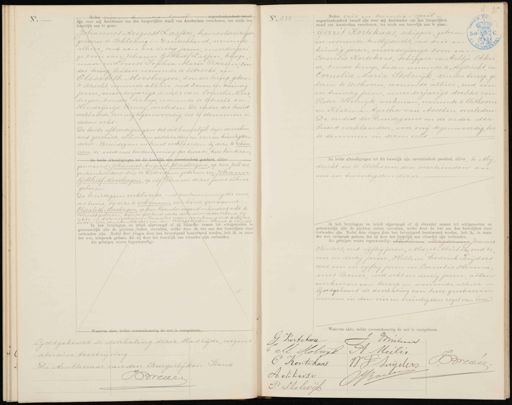 negentienhonderd twaalf Heden vier en zijn voor mij Ambtenaar van den burgerlijken stand van Amsterdam verschenen, ten einde een, huwelijk aan te gaan: Johannes August Lassen handelsreiziger, geboren te Schleswig in Duitschland, wonende alhier, oud een en dertig jaren meerderjari ge zoon van Johann Gotthilf Lassen, koopman en Louise Sophia Maria Petersen zon der beroep beiden wonende te Utrecht en Elisabeth Molsbergen, zonder beroep, geboren te Utrecht, wonende alhier oud zeven en twintig jaren, meerderjarige dochter van Cornelis Moes bergen, zonder beroep, wonende te Ytrecht en Hendrijntje Verweij, overleden De vader der bruid verklaarde, voor mij tegenwoordig, toe te stemmen in dezen echt De beide afkondigingen tot dit huwelijk zin onverhin derd geschied, alhier den veertienden en een en twintigsten dezer. Bruidegom en bruid verklaarden bij deze te erkennen, de eerste met toestemming der tweede, twee kinderen, De beide afkondigingen tot dit huwdlijk zijn onverbinderd geschied alhier genaamd: Johannes August Moesbergen, op twee Juli ne gentienhonderd drie te Rotterdam geboren en Johann Gotthilf Moesbergen, op elf Februari dezes jaars alhier geboren De bruidegom verklaarde met toestemming der moe derbruid bij deze te erkennen, een kind, genaamd: Elisabeth Moesbergen, op drie November negentienhonderd acht te Utrecht geboren zijnde dit kind reeds door de moeder erkend bij akte in dato negentien November negentienhonderd acht ver leden voor den Ambtenaar van den Burgerlijken Stand te Utrecht Ik heb bruidegom en bruid afgevraagd of zij elkander nemen tot echtgenooten en getrouwelijk alle de plichten /zullen vervullen, welke door de wet aan den huwelijken staat verbonden zijn. Nadat deze vragen door hen bevestigend beantwoord werden, heb ik, in naam der wet, uitspraak gedaan, dat zij door het huwelijk aan elkander zijn verbonden. Als getuigen waren tegenwoordig: velke overeenkomstig de wet is voo No. 235 Heden vier en twintig April negentienhonderd twaalf zijn voor mij Ambtenaar van den burgerlijken stand van Amsterdam verschenen, ten einde een huwelijk aan te gaan: Gerrit Kortekaas, schipper, geboren (en wonende te Mijdricht, oud drie en1 twintig jaren, meerderjarige zoon van Cornelis Kortekaas, schipper en Aaltje Okker se, zonder beroep, beiden wonende te Mijdrecht, en Cornelia Maria Stolwijk, zonder beroep, ge boren te Uithoorn, wonende alhier, oud een en twintig jaren, meerderjarige dochter van Pieter Stolwijk, werkman, wonende te Uithoorn en Klazina Agatha van Asselen overleden De ouders des bruidegoms en de vader der bruid verklaarden, voor mij tegenwoordig, toe te stemmen in dezen echt De beide afkondigingen tot dit huwelijk zijn opverhinderd geschied, alhier, te Mij drecht en te Uithoorn den veertienden en een en twintigsten dezer Ik heb bruidegom en bruid afgevraagd of zij elkander nemen tot echtgenooten en getrouwelijk alle de plichten zullen vervullen, welke door de wet aan den huwelijken staat verbonden zijn. Nadat deze vragen door hen bevestigend beantwoord werden, heb ik, in naam der wet, uitspraak gedaan, dat zij door het huwelijk aan elkander zijn verbonden. Als getuigen waren tegenwoordig: Willem Joannes Hinters, oud vijftig jaren, Aldert Meilis, oud ze ven en dertig jaren, Willem Frederik Snijders oud een en vyftig jaren en Cornelis Herma, nus Bouer, oud acht en dertig jaren, allen werkman van beroep en wonende alhier. Goedgekeurd de doorhaling van twee geschreven woorden in den vier en twintigsten regel van boven Waarvan akte, welke overeenkomstig de wet is voorgelez Goedgekeurd de doorhaling dezer bladzijde, wegens abrisieve beschrijving De Ambtenaar van den Burgerlijken Stand Iredee Puteus G: Kortekaa C M. Sobwik A Meilis Brevee C Kortekaas W.ITnijders Boeden Aokkerse P Sholwijk