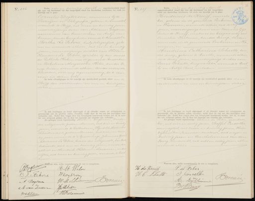 No. 236 Heden vier en twintig April negentienhonderd twaalf zijn voor mij Ambtenaar van den burgerlijken stand van Amsterdam verschenen, ten einde een huwelijk aan te gaan: Cornelis Dogterom, commies bij de Posterijen en Telegrafie, geboren te Ammerstol wonende te Strijp, oud zeven en twintig jaren, meerderjarige zoon van Adrianus Dogterom, aannemer van bouwwerken en Antje van Zessen, zonder beroep beiden wonende te Ammerstol, en Bertha Le Febrre, hulptelegrafiste, gebo- ren en wonende alhier, oud zes en twintig jaren, meerderjarige dochter van Willem Clandius Le Febrre, opzichter bij den dienst der Publieke Werken van de gemeente Amsterdam en Bekelina Margaretha Weber, zonder be roep, beiden wonende alhier. Beider ouders ver klaarden, voor mij tegenwoordig, toe te stem„ men in dezen echt De beide afkondigingen tot dit huwelijk zijn onverhinderd geschied, alhier en te Strijp den veertienden en een en twintigsten dezer Ik heb bruidegom en bruid afgevraagd of zij elkander nemen tot echtgenooten en getrouwelijk alle de plichten zullen vervullen, welke door de wet aan den huwelijken staat verbonden zijn. Nadat deze vragen door hen bevestigend beantwoord werden, heb ik, in naam der wet, uitspraak gedaan, dat zij door het huwelijk aan elkander zijn verbonden. Als getuigen waren tegenwoordig: Willem Dogterom, broeder des echtgenoots, postambtenaar, oud drie en twintig jaren, wonende te Rotterdam, Hijndelt Martinus Scheidemans, postambtenaar oud zeven en twin tig jaren, wonende te s. Gravenhage, Johannes Gerrit Adrianus Le Febore, broeder der echtgenoote, kantoor bediende oud een en twintig jaren, wonende alhier en Hendrik Willem Marsman onder wijzer, oud zeven en twintig jaren, wonende te Oost daar No. 237 Heden vier en twintig April negentienhonderd twaalf zijn voor mij Ambtenaar van den burgerlijken stand van Amsterdam verschenen, ten einde een huwelijk aan te gaan: Hendricus de Kruijf, vuursto„5 ker geboren in de gemeente Vinkeveen en Waverveen, wonende alhier oud dertig jaren, meerderjarige zoon van Cornelis Gijs bertus de Kruyf, matroos ter koopvaardij en Cornelia Reetman, zonder beroep, beiden wonende in de gemeente Vinkeveen en Ha verveen, en Hendrina Catharina Schutte zon der beroep, geboren te Zwolle wonende alhier oud dertig jaren, meerderjarige dochter van Lucas Schutte, brugwachter, wonende te Zwol le en Aaltje Best overleden De beide afkondigingen tot dit huwelijk zijn onverhinderd geschied, alhier den veertienden en een en twintigsten dezer Ik heb bruidegom en bruid afgevraagd of zij elkander nemen tot echtgenooten en getrouwelijk alle de plichten zullen vervullen, welke door de wet aan den huwelijken staan verbonden zijn. Nadat deze vragen door hen bevestigend beantwoord werden, heb ik, in naam der wet, uitspraak gedaan, dat zij door het huwelijk aan elkander zijn verbonden. Als getuigen waren tegenwoordig: Petrus de Feber, grondwer ker, oud vier en dertig jaren Stoffel Cusveller varensgezel oud zeven en twintig jaren, Hein Dijkhuizen, tramconducteur, oud negen en twintig jaren en Bartholomeus van den Burg, brandwacht, oud acht en dertig jaren, allen wonende alhier Waarvan akte, welke overeenkomstig de wet is voorgelezen. Haarvan akte, welke overeenkomstig de wet is voorgelezen. PDoguer B.M. Webeu WDogton B Lekebvre W M. Scheiden Brevee A Dogterom Bethekebrrn A van Zessen HWMarsman J.A L Febm H de Kruyf P de Feber J Gnneller H: C: Ahutt Brevee H. Dykhuizen BvBBurg