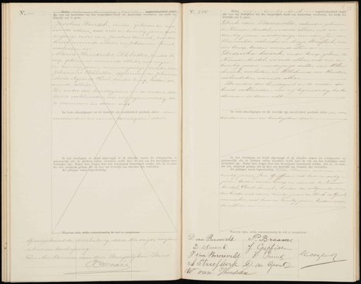 negentienhonderd twaalf zin voor mij Ambtenaar van den burgerlijken stand van Amsterdam verschenen, ten einde een, huwelijk aan te gaan: Jacobus Bensch, venter, geboren en wo nende alhier, oud acht en twintig jaren, meer derjarige zoon van Jacobus Bensch, zonder beroep, wonende alhier en Johanna Smit overleden, en Maria Hendrika Schlatter, zonder be roep, geboren en wonende alhier, oud negen en twintig jaren, meerderjarige dochter van Johannes Schlatter, opperman en Johanna Maria Agnes de Haal, zonder beroep, beiden wo nende alhier. De vader des bruidegoms en de ouders der bruid verklaarden, voor mij tegenwoordig, toe te stemmen in dezen echt De beide afkondigingen tot dit huwelijk zijn onverhinderd geschied, alhier - den veertienden en een en twintigsten dezer. Ik heb bruidegom en bruid afgevraagd of zij elkander nemen tot echtgenooten en getrouwelijk alle de plichten/ zullen vervullen, welke door de wet aan den huwelijken staat verbonden zijn. Nadat deze ragen door hen bevestigend beantwdord werden, heb ik, in naam der wet, uitspraak gedaan, dat zij door het huwelijk aan elkander zijn verbonden. Als getuigen waren tegenwoordig: NNo. 240 Heden vijf en twintig April negentienhonderd twaalf zijn voor mij Ambtenaar van den burgerlijken stand van Amsterdam verschenen, ten einde een huwelijk aan te gaan: Dirk van Barneveld, verhouder, geboren te Nieuwer-Amstel, wonende alhier, oud vier en twintig jaren, meerderjarige zoon van Jan van Barneveld, verhouder en tagje streefkerk, ron„ der beroep, beiden wonende alhier en Diderika Smink, zonder beroep, geboren te Nieuwer-Amstel, wonende alhier, oud vier en twintig jaren, meerderjarige dochter van Willem smink, overleden en Wilhelmina van Heusden verhoudster, wonende alhier. De ouders des bruidegoms en de moeder der bruid verklaarden, voor mij tegenwoordig, toe te stemmen in dezen echt.- De beide afkondigingen tot dit huwelijk zijn onverhinderd geschied, alhier den veer„ tienden en een en twintigsten dezer. Ik heb bruidegom en bruid afgevraagd of zij elkander nemen tot echtgenooten en getrouwelijk alle de plichten zullen vervullen, welke door de wet aan den huwelijken staan verbonden zijn. Nadat deze vragen door hen bevestigend beantwoord werden, heb ik, in naam der wet, uitspraak gedaan, dat zij door het huwelijk aan elkander zijn verbonden. Als getuigen waren tegenwoordig: Pieter Praam, oud zeven en twintig jaren; Jan Griffioen, oud twee en dertig jaren, beiden zonder beroep en wonende te Nieuwer Amstel, Evert Smink, broeder der echtgenoote, zon„ der beroep, oud zes en twintig jaren en Dirk de Groot, vuurwerker, oud twee en twintig jaren, beiden wonen„ de alhier. arvan akte, welke overeenkomstig de wet is voorgelezen. Goedgekeurd de doorhaling dezer bladzijde, wegens abuisiere beschrijving De Ambtenaar van den Burgerlijken Stand Bwreuee D: van Burneveld P:. Braam. D: Smink: J. Guffioen Valogten J Van Barneveld C Smink A Streeskerk D. de Groot W van Jheusvren