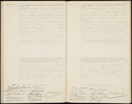 No. 243 Heden vijf en twintig April negentienhonderd twaalf zijn voor mij Ambtenaar van den burgerlijken stand van Amsterdam verschenen, ten einde een huwelijk aan te gaan: Johannes Coenraad Verheul, kan toorbediende, geboren en wonende alhier, oud zes en twintig jaren, meerderjarige zoon van Johannes Coenraad Verheul, timmerman en Cornelia Elisabeth Willems, zonder beroep, beiden wonende alhier en Johanna van den Bosch, zonder beroep, geboren te Nieuwer, Amstel, wonende alhier, oud vijf en twintig jaren, meerderja„ rige dochter van Gerhardus van den Bosch, handelsreiziger en Johanna Keyman, zon„ der beroep, beiden wonende alhier. Beider ouders verklaarden, voor mij tegen„ woordig, toe te stemmen in dezen echt De beide afkondigingen tot dit huwelijk zijn onverhinderd geschied, alhier den veertienden en een en twintigsten dezer.— Ik heb bruidegom en bruid afgevraagd of zij elkander nemen tot echtgenooten en getrouwelijk alle de plichten zullen vervullen, welke door de wet aan den huwelijken staat verbonden zijn. Nadat deze vragen door hen bevestigend beantwoord werden, heb ik, in naam der wet, uitspraak gedaan, dat zij door het huwelijk aan elkander zijn verbonden Als getuigen waren tegenwoordig: Gerhardus van den Bosch, broe„ der der echtgenoote, boekhouder, oud een en dertig ja„ ren, Coenraad Verheul, oom des echtgenoots, bank„ houder bij de stads-Bank van Leening, oud vier en veer tig jaren, Marinus Cornelis Verheul, broeder des echt„ genoots, barbier, oud vijf en twintig jaren en Pierre Jacques Woortman, boekhouder, oud zes en twintig jaren, allen wonende alhier. Heden vijf en twintig April negentienhonderd twanld zijn voor mij Ambtenaar van den burgerlijken stand van Amsterdam verschenen, ten einde een huwelijk aan te gaan: Petrus van Loest, meubelmaker, geboren en wonende alhier, oud drie en twintig jaren, meerderjarige zoon van Dirk Petrus van Soest, meubelmaker, wonende alhier en Ca„ tharina Joanna Maria ten Kroode, over„ leden en Wilhelmina Francisca Swaager, zonder beroep, geboren en wonende alhier, oud twintig jaren, minderjarige dochter van Cor„ nelis Petrus Swaager, agent van politie en Wilhelmina Johanna Hendrika Kök, zon der beroep, beiden wonende alhier. De vader des bruidegoms en de ouders der bruid verklaarden, voor mij tegenwoordig, toe te stemmen in dezen echt. De beide afkondigingen tot dit huwelijk zijn onverhinderd geschied, alhier den veertienden en een en twintigsten dezer.— Ik heb bruidegom en bruid afgevraagd of zij elkander nemen tot echtgenooten en getrouwelijk alle de plichten zullen vervullen, welke door de wet aan den buwelijken staan verbonden zijn. Nadat deze vragen door hen bevestigend beantwoord werden, heb ik, in naam der wet, uitspraak gedaan, dat zij door het huwelijk aan elkander zijn verbonden. Als getuigen waren tegenwoordig: Anthonie de Vries, zonder be„ roep, oud een en zeventig jaren, Petrus Gerardus- Heilman, zwager des echtgenoots, schoenmaker, oud zeven en dertig jaren, Ludovicus Johannes Corne„ lus van Soest, broeder -des echtgenoots, meubelma„ ker, oud zes en dertig jaren en Wilhelm Spitz; meubelmaker, oud zes en twintig jaren, allen wonen„ de alhier. larvan akte, welke overeenkomstig de wet is voorgelezen. larvan akte, welke overeenkomstig de wet is voorgelezen. sterken J Juyman Joh van den Bosch.Ooposch Vawokerdo JJb Verhuul C Verhens M erpeul CE Willens J JBoodm A van den Bosch P van Soest A de Vries W.T. Swaagerin E C Heilman Vawaterer DF van Zagt C.P. Swaagen HGe G van Soest. WJ H Kok W ofoch