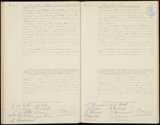 No. 251 Heden een Mei negentienhonderd twaalf zijn voor mij Ambtenaar van den burgerlijken stand van Amsterdam verschenen, ten einde een huwelijk aan te gaan: Casper de Leth, sluiswachter, geboren en wonende alhier, oud zes en twintig jaren, meer„ derjarige zoon van Casper de Leth, zonder be„ roep, wonende alhier en Johanna Catharina - Koopal, overleden en Bertha Johanna Hendrika Hartman„ zonder beroep, geboren te Nieuwer Amstel, wonende al„ hier, oud zes en twintig jaren, meerderjarige dochter van Cornelis Petrus Adrianus Hartman, huisschilder en Bartha Vierveijzer, zonder beroep, beiden wonen„ de alhier. De vader des bruidegoms en de ouders der bruid ver„ klaarden, voor mij tegenwoordig, toe te stemmen in de„ zen echt. De beide afkondigingen tot dit huwelijk zijn onverhinderd geschied, alhier den een- en twintigsten en acht en twintigsten Apil laatst„ leden.— Ik heb bruidegom en bruid afgevraagd of zij elkander nemen tot echtgenooten en getrouwelijk alle de plichten zullen vervullen, welke door de wet aan den huwelijken staat verbonden zijn. Nadat deze vragen door hen bevestigend beantwoord werden, heb ik, in naam der wet, uitspraak gedaan, dat zij door het huwelijk aan elkander zijn verbonden. Als getuigen waren tegenwoordig: Jacob de Leth, broeder des echtgenoots, magazijnknecht, oud een en twintig jaren, Hendrik de Leth, oom der echtgenoots, groveur, oud vijftig jaren, Willibrordus Petrus Hartman, tram„ condusteur, oud negen en twintig jaren en Cornelis Alphonsus Hartman, tuinman, oud twee en dertig jaren, beiden broeder der echtgenoote, allen wonen„ de alhier. aarvan akte, welke overeenkomstig de wet is voorgelezen. No. 252 Heden —een Mei Wegentienhonderd twaalf zijn voor mij Ambtenaar van den burgerlijken stand van Amsterdam verschenen, ten einde een huwelijk aan te gaan: Nicolaas Henneman, tuinier, geboren en wonende te Heemskerk, oud zes en twintig jaren, meerderjarige zoon van Gerrit Henneman, tuinier en Petronella sombeek, zonder beroep, beiden wonende te Heemskerk en Margaretha Francisca Kool, zon„ der beroep, geboren te Nieuwer-Amstel, wonen„ -de alhier, oud vijf en twintig jaren, meerder„ jarige dochter van Albert Kool, melkslijter. en Catharina Geertruida Taat, zonder beroep, beiden wonende alhier. Beider ouders verklaarden, voor mij tegen„ woordig, toe te stemmen in dezen echt.- De beide afkondigingen tot dit huwelijk zijn onverhinderd geschied, alhier en te Heemskerk, den eén en twintigsten en acht en twintigsten April laatstleden- Ik heb bruidegom en bruid afgevraagd of zij elkander nemen tot echtgenooten en getrouwelijk alle de plichten zullen vervullen, welke door de wet aan den huwelijken staan verbonden zijn. Nadat deze vragen door hen bevestigend beantwoord werden, heb ik, in naam der wet, uitspraak gedaan, dat zij door het huwelijk aan elkander zijn verbonden. Als getuigen waren tegenwoordig: Hendricus Seesterbeek, tim„ merman, oud dertig jaren, Engelmundurs Henne„ man, oom des echtgenoots, landbouwer, oud drie en vijftig jaren, beiden wonende te Heemskerk; Ja„ cobus Gildemeijer, zwager des echtgenoots, werkma oud zes en dertig jaren, wonende te Alkwaar en Lambertus Henneman, neef des echtgenoots, warmoe zier, oud een en twintig jaren, wonende te Heemskerk Waarvan akte, welke overeenkomstig de wet is voorgelezen. C. de Leth / J/ de Leth P. J. H Hartman H. de Leth Brevel C de Lett W. Hartma C RA Haotnn A: Hartman B Vierdeyzer N: Henmeman C. G laat MF. Kool H Heerterbeek Brevel E Hermemar G Henneman P Somberk J Gildemeyer Henneman A Kaol