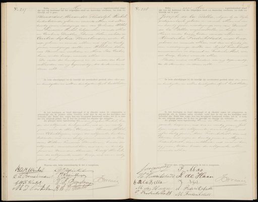 No. 257 Heden — een Mei negentienhonderd twaalf zijn voor mij Ambtenaar van den burgerlijken stand van Amsterdam verschenen, ten einde een huwelijk aan te gaan: Bernardus Alexander Rudolph Winkel„ kantoorbediende, geboren en wonende alhier, oud acht en twintig jaren, meerderjarige zoon van Gerhardus Wilhel„ mus Franciscus Winkel, horlogemaker, wonende alhier en Carolina Dorsthea Johanna telen, overleden en Cecilia Sophia Bemelman, zonder be roep, geboren en wonende alhier, oud vijf en twintig jaren, meerderjarige dochter van Wilhelmus Adria, nus Bemelman, overleden en Maria Ida Castri„ kum, zonder beroep, wonende alhier. De vader des bruidegoms en de moeder der bruid verklaarden, voor mij tegenwoordig, toe te stemmen in dezen echt. De beide afkondigingen tot dit huwelijk zijn onverhinderd geschied, alhier den een en twintigsten en acht en twintigsten April laatstleden. Ik heb bruidegom en bruid afgevraagd of zij elkander nemen tot echtgenooten en getrouwelijk alle de plichten zullen vervullen, welke door de wet aan den huwelijken staat verbonden zijn. Nadat deze vragen door hen bevestigend beantwoord werden, heb ik, in naam der wet, uitspraak gedaan, dat zij door het huwelijk aan elkander zijn verbonden. Als getuigen waren tegenwoordig: Gerardus Josephus Winkel, broe„ der des echtgenoots, horlogemaker, oud een en veertig jaren, wonende alhier, Christiaan Theodorus Wilhel„ mus Ebbinkhuysen, zwager des echtgenoots, kantoor„ bediende, oud zes en dertig jaren, wonende te Bus„ sum, Willem Fransiscus Bemelman, broeder der echtgenoote, decoratieschilder, oud zeven en twintig, jaren en Bernardus Alexander Rudolf Winkel, oom des echtgenoots, zonder beroep, oud een en zestig jaren, beiden wonende alhier. overeenko No. 258 Heden —een Mei negentienhonderd twaalf zijn voor mij Ambtenaar van den burgerlijken stand van Amsterdam verschenen, ten einde een huwelijk aan te gaan: Joseph de la Bella, schrijver bij de Rijks„ postspaarbank, geboren en wonende alhier, oud vier en twintig jaren, meerderjarige zoon van Daniel de la Bella, roosjesversteller en Mietje de Haan, zonder beroep, beiden wonende alhier en Hendrika Fredrikstadt, zonder beroep; geboren en wonende alhier, oud drie en twintig ja„ ren, meerderjarige dochter van Israël Fredrikstadt; commissionnair in diamant en Frederika Abas, zon„ der beroep, beiden wonende alhier. Beider ouders verklaarden, voor mij tegenwoordig„ toe te stemmen in dezen echt.- De beide afkondigingen tot dit huwelijk zijn onverhinderd geschied, alhier den een en twintigsten en acht en twintigsten April laatstleden Ik heb bruidegom en bruid afgevraagd of zij elkander nemen tot echtgenooten en getrouwelijk alle de plichten zullen vervullen, welke door de wet aan den huwelijken staat verbonden zijn. Nadat deze vragen door hen bevestigend beantwoord werden, heb ik, in naam der wet, uitspraak gedaan, dat zij door het huwelijk aan elkander zijn verbonden. Als getuigen waren tegenwoordig: Cevie de Haan, oom des echt„ genoots, koopman, oud drie en veertig jaren, Joel sijes, zager der echtgenoote, diamantslijper, oud vijf en dertig jaren, Asser Frederikstadt, diamant„ kloover, oud negen en twintig jaren en Meijer Frederikstadt, diamantkloover, oud zeven en twin„ tig jaren, beiden broeder der echtgenoote, allen wonende alhier in akte, GJ Eelinkel BaR Winkel C.S. Bemelman J WEssenkhuysen G WH Winkel W. P Bemelman Drevee M I Cartiehan BWt R WWonkel okte, welke mstig de wet is voorgelezen. Duecameen F Abas H Frederikstad L de Haan Jreuee 6 Dld BellaG: Bijes M de Haan A. Frederik stadt Fredrik Stads M Frederik Stadt