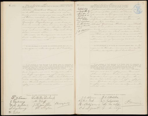No. 261 Heden — twee Mei negentienhonderd twinti zijn voor mij Ambtenaar van den burgerlijken stand van Amsterdam verschenen, ten einde een huwelijk aan te gaan: Pieter Jacobus Crum, barbier, geboren te Alkmaar, wonende alhier, oud vier en twintig jaren, meerderjarige zoon van Joost Karel Crum, overleden en Johanna Maria. sieuwers, zonder beroep, wonende alhier en Grietje Vogelezang, zonder beroep, geboren en wonende alhier, oud zes en twintig jaren, meerderjarige dochter van Abraham Sogelezang, werkman en Helena Klop, zonder beroep, beiden wonende alhier. De moeder des bruidegoms en de ouders der bruid verklaarden, voor mij tegenwoordig, toe te stemmen in dezen echt.De beide afkondigingen tot dit huwelijk zijn onverhinderd geschied, alhier den een en twintigsten en acht en twintigsten April laatstleden. Ik heb bruidegom en bruid afgevraagd of zij elkander nemen tot echtgenooten en getrouwelijk alle de plichten zullen vervullen, welke door de wet aan den huwelijken staat verbonden zijn. Nadat deze vragen door hen bevestigend beantwoord werden, heb ik, in naam der wet, uitspraak gedaan, dat zij door het huwelijk aan elkander zijn verbonden. Als getuigen waren tegenwoordig: Louis Marie Bernard van Lieshout, loodgieter, oud vier en twintig jaren, Martinus Korff, roosjesslijper, oud vijf en dertig jaren; Johannes Hermanus van Velsen, huisschilder, oud acht en twintig jaren, allen zwager der echtgenoote en Hendrik Stigter, werkman, oud twee en vijftig jaren, allen wonende alhier 80 No. 262 Echtscheiding uitgesproten by Rechtbank te vonnis der Amsterdam van 3 October 1946 ingeschreven te Amsterdam teden 7 November JR Wen Heden twee Mei negentienhonderd twaalf zijn voor mij Ambtenaar van den burgerlijken stand van Amsterdam verschenen, ten einde een huwelijk aan te gaan: Johannes Cornelis Schijvens, agent van politie, geboren te Baardwijk, wonende te Nijmegen, oud twee en twintig jaren, meerderjarige zoon van Quirinus schijvens, schoenmaker, wonende alhier en Ma ria de Nijs, overleden en Alida Gesina Helena van Beek zonder beroep, geboren en wonende alhier, oud een en twintig jaren, meerderjarige dochter van Franciscus Jacobus van Beek, overleden en Catharina Helena de Groot, zonder beroep, wonende alhier De vader des bruidegoms en de moeder der bruid verklaarden, voor mij tegenwoordig, toe te stemmen in dezen echt.De beide afkondigingen tot dit huwelijk zijn onverhinderd geschied, alhier, te Nijmegen en te Haarlem, den een en twintigsten en acht en twintigsten April laatstleden.Ik heb bruidegom en bruid afgevraagd of zij elkander nemen tot echtgenooten en getrouwelijk alle de plichten zullen vervullen, welke door de wet aan den huwelijken staat verbonden zijn. Nadat deze vragen door hen bevestigend beantwoord werden, heb ik, in naam der wet, uitspraak gedaan, dat zij door het huwelijk aan elkander zijn verbonden, Als getuigen waren tegenwoordig: Johannes Cornelis Mulder, behanger, oud drie en vijftig jaren, Leonardus Johannes Schijvens, broeder des echtgenoots, tramconducteur, oud negen en twintig jaren, Louren, tius de Nijs, schoenmaker, oud vijf en vijftig jaren en Gijsbertus de Nijs, schoenmaker, oud vier en vijftig jaren, beiden oom des echtgenoots, allen wonende alhier. Waarvan welke overeenkom J. MeBa Sieshout P: J: Crum M. Kerff G Vogibrang Valogtond J.H. van Velzen J MH Suenters M Vogelezang H. Stigter ah Klop. J SMulder J. C. Schijvens L. J. Schijvens A G H v Beek. Doreceel R Schyven L de Nijs G de Nijs C L de Groot
