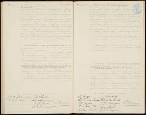 No. 267 Heden twee Mbei negentienhonderd twaalf zijn voor mij Ambtenaar van den burgerlijken stand van Amsterdam verschenen, ten einde een huwelijk aan te gaan: Johann Wilhelm August Grändorf, winkelbediende, geboren te Osterode in Duitsch land, wonende alhier, oud acht en twintig ja„ ren, Duitscher meerderjarige zoon van Karl August Grändort, spoorwegambtenaar en Sophie Christiane Ernstine Schatz, zonder beroep, beiden wonende te Warburg in Duitschland en Anna Maria Carolina Smitz, zonder beroep geboren te Nijmegen, wonende alhier, oud zes en twintig jaren meerderjarige dochter van Carolus Josephus Albertus Smitz en Anna Ma ria van Well, beiden zonder beroep en wonende te Rotterdam. De beide afkondigingen tot dit huwelijk zijn onverhinderd geschied, alhier den een en twintigsten en acht en twintigsten April laatst, leden. Bij deze akte is tevens overgelegd een proces-verbaal van tusschenkomst van den Rechter in het kanton Amsterdam, waaruit blijkt dat de ouders der bruid op de gproeping niet zin verschenen. Ik heb bruidegom en bruid afgevraagd of zij elkander nemen tot echtgenooten en getrouwelijk alle de plichten zullen vervullen, welke door de wet aan den huwelijken staat verbonden zijn. Nadat deze vragen door hen bevestigend beantwoord werden, heb ik, in naam der wet, uitspraak gedaan, dat zij door het huwelijk aan elkander zijn verbonden. Als getuigen waren tegenwoordig: Hendrik Stigter oud twee en vijftig jaren, Hendrik Anthonie Siemerink oud zeventig jaren, Jacobus Hendrik Roch, oud negen en zestig jaren en Cornelis Herman Hernars oud acht en veertig jaren, allen werkman van beroep, en wonende alhier. Waarvan akte, welke overeenkomstig de wet is voorgelezen. No. 268 Heden twee Mei negentienhonderd twaalf zijn voor mij Ambtenaar van den burgerlijken stand van Amsterdam verschenen, ten einde een huwelijk aan te gaan: Machiel Segers, kapper, geboren te Helder, wonende alhier, oud vier en 2: twintig jaren, meerderjarige zoon van Hendrik Segers en Regina van Doorn, bei den zonder beroep en wonende alhier en Catharina Johanna van Esveld, zon der beroep, geboren en wonende alhier oud twee en twintig jaren, meerderjarige dochter van Lauwerens van Esveld timmerman en Antje Roorenhof, zonder beroep, beiden wo nende alhier Beider ouders verklaarden, voor mij tegen- woordig, toe te stemmen in dezen echt.— De beide afkondigingen tot dit huwelijk zijn onverhinderd geschied, alhier den eer en twintigsten en acht en twintigsten April laatstleden Ik heb bruidegom en bruid afgevraagd of zij elkander nemen tot echtgenooten en getrouwelijk alle de plichten zullen vervullen, welke door de wet aan den huwelijken staat verbonden zijn. Nadat deze vragen door hen bevestigend beantwoord werden, heb ik, in naam der wet, uitspraak gedaan, dat zij door het huwelijk aan elkander zijn verbonden Als getuigen waren tegenwoordig: Aleidus Louis Cornelis van Esveld, broeder der echtgenoote schoenmaker, oud drie en dertig jaren, Johannes Valentijn Clemens zwager des echtgenoots, handelsagent, oud zes en dertig jaren, Lauwrens van Osveld, broeder der echtgenoote, gasmeteropnemer oud negen en twin tig jaren en Petrus Josephus Henricus Hubertus Cuypers zwager der echtgenoote, handelsagent, oud vier en twintig jaren, allen wonende alhier. Waarvan akte, welke overeenkomstig de wet is vor J: W: A. Grandorf H. Stigtel HoA Siemerimr A: M. C. Smitz Brevee J H: Koch H Vernwes A Koorenhoff M Segers E.J. van Eweld A.L. C. van Erveld Breeel V Cemens H Segers J P VDoorm L van Msvelt. L Van Edeld PJWH Cuypers.