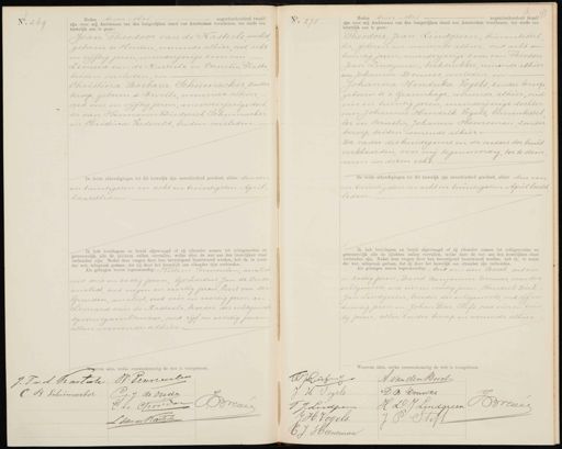 No. 269 Heden twee Mei negentienhonderd twaalf zijn voor mij Ambtenaar van den burgerlijken stand van Amsterdam verschenen, ten einde een huwelijk aan te gaan: Joan Theodoor van de Kasteele analist geboren te Houten, wonende alhier, oud acht en vijftig jaren, meerderjarige zoon van Leonerd van de Kasteele en Cornelia Platte beiden overleden, en Christina Barbara Schumacher zonder beroep, geboren te Zwolle, wonende alhier oud een en vijftig jaren, meerderjarige doch ter van Hermann Diederich Schumacher en Christina Vredeveld, beiden overleden. De beide afkondigingen tot dit huwelijk zijn onverhinderd geschied, alhier den eers en twintigsten en acht en twintigsten April- laatstleden Ik heb bruidegom en bruid afgevraagd of zij elkander nemen tot echtgenooten en getrouwelijk alle de plichten zullen vervullen, welke dóor de wet aan den huwelijken staat verbonden zijn. Nadat deze vragen door hen bevestigend beantwoord werden, heb ik, in naam der wet, uitspraak gedaan, dat zij door het huwelijk aan elkander zijn verbonden. Als getuigen waren tegenwoordig: Willem Vermeulen, analist oud drie en zestig jaren, Gerhardus Jan de Oude analist, oud negen en veertig jaren, Evert van der Gronden, analist, oud vier en veertig jaren en Leonard van de Rasteele, broeder des echtgenoots spoorwegambtenaar oud vijf en veertig jaren allen wonende alhier No. 270 Heden twee Mei negentienhonderd twaalf zijn voor mij Ambtenaar van den burgerlijken stand van Amsterdam verschenen, ten einde een huwelijk aan te gaan: Theodore Jean Lindgreen, brievenbestel ler, geboren en wonende alhier, oud acht en twintig jaren, meerderjarige zoon van Theodore Jean Lindgreen, boekdrukker wonende alhier en Johanna Douwes overleden, en Johanna Hendrika Vogels, zonder beroep geboren te 's-Gravenhage, wonende alhier, oud vier en twintig jaren, meerderjarige dochter van Johannes Hendrik Vogels, brievenbestel ler en Cornelia Johanna Heeneman zonder beroep, beiden wonende alhier. De vader des bruidegoms en de ouders der bruid verklaarden voor mij tegenwoordig, toe te stem men in dezen echt. De beide afkondigingen tot dit huwelijk zijn onverhinderd geschied, alhier den een en twintigsten en acht en twintigsten April laatst leden. Ik heb bruidegom en bruid afgevraagd of zij elkander nemen tot echtgenooten en getrouwelijk alle de plichten zullen vervullen, welke door de wet aan den huwelijken staat verbonden zijn. Nadat deze vragen door hen bevestigend beantwoord werden, heb ik, in naam der wet, uitspraak gedaan, dat zij door het huwelijk aan elkander zijn verbonden. Als getuigen waren tegenwoordig: Arie van den Bosch oud vier en zestig jaren, David Benjamin Douwes, oom des echtgenoots, oud vier en veertig jaren Hendrik Dirk Jan Lindgreen, broeder des echtgenoots oud vijf en twintig jaren en Johan Peter Stift, oud vier en twin tig jaren, allen zonder beroep en wonende alhier. Waarvan akte, welke overeenkomstig de wet in akte, wel J. Pvd Kaitete W: Vemneeilen C B Schiimoecker 1.7. de Oude Cno Coosder Brecee L van de Kastene A J essens A. Van den Bosct DB. Douwer J. H. Vogels H. D.J. Lindareen Brevee JJ. Lirdpe P Stift J H. Vogels. C J. Heeneman