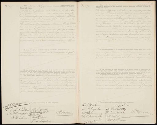 No. 271 Heden twee Mbei negentienhonderd twaal zijn voor mij Ambtenaar van den burgerlijken stand van Amsterdam verschenen, ten einde een huwelijk aan te gaan: Josephus Johannes Petrus Nollet kap„ per, geboren en wonende alhier oud dertig ja ren, meerderjarige zoon van Josephus Mollet overleden en Antonetta Gabriels, zonder be roep, wonende alhier, en Christina Geertruida Maria Alida Drent zonder beroep, geboren en wonende alhier, oud vier en twintig jaren, meerderjarige dochter van Hendrik Drent concierge en Alida Piesler, zonder beroep beiden wonende alhier De ouders der bruid verklaarden voor mij te„ genwoordig, toe te stemmen in dezen echt.- De beide afkondigingen tot dit huwelijk zijn onverhinderd geschied, alhier den een en twintigsten en acht en twintigsten April- laatstleden Ik heb bruidegom en bruid afgevraagd of zij elkander nemen tot echtgenooten en getrouwelijk alle de plichten zullen vervullen, welke door de wet aan den huwelijken staat verbonden zijn. Nadat deze vragen door hen bevestigend beantwoord werden, heb ik, in naam der wet, uitspraak gedaan, dat zij door het huwelijk aan elkander zijn verbonden. Als getuigen waren tegenwoordig: Johannes Reinier Lagerweg koetsier oud acht en vijftig jaren, Jacob Hendrik Borgmeijer, koopman, oud twee en dertig jaren Theodor Henri Polman, muziekonderwizer oud acht en dertig jaren en Johannes van Langelaan zwager des echtgenoots bankwerker, oud een en dertig jaren, allen wonende alhier No. 272 Heden twee Mei negentienhonderd twaalf zijn voor mij Ambtenaar van den burgerlijken stand van Amsterdam verschenen, ten einde een huwelijk aan te gaan: Leizer Nussen Rohn, cartonnagewerker geboren te Plonsk in Rusland wonende alhier oud acht en twintig jaren, Rus, meerderjari ge zoon van Abraham Leeuw Kohn car tonnagewerker en Chaja Kowadlo zonder beroep beiden wonende te Slock in Rusland en Sulamith Rijski zonder beroep, geboren en wonende alhier oud vier en twintig jaren meerderjarige dochter van Elias Rijski en Cha sie Lapides; beiden zonder beroep en wonende alhier. Beider ouders verklaarden voor mij tegenwoordig, toe te stemmen in dezen echt. De beide afkondigingen tot dit huwelijk zijn onverhinderd geschied, alhier den vier den en elfden Februari laatstleden Bij deze akte is tevens overgelegd een akte van be kendheid van geboorte van den bruidegom. Ik heb bruidegom en bruid afgevraagd of zij elkander nemen tot echtgenooten en getrouwelijk alle de plichten zullen vervullen, welke door de wet aan den huwelijken staat verbonden zijn. Nadat deze vragen door hen bevestigend beantwoord werden, heb ik, in naam der wet, uitspraak gedaan, dat zij door het huwelijk aan elkander zijn verbonden. Als getuigen waren tegenwoordig: Moses Perlmutter koopman oud vier en veertig jaren, Henoch Zamtfort koop man, oud zestig jaren, Michel Polak electricien oud een en twintig jaren en Henri Siegfried Beem, monteur, oud twee en twintig jaren, al len wonende alhier Waawan alde, welke op le wet ie voorgelezen. JAdolk Wanan ale, waelke ofereenkonddig de velis voorgeete. HG.H. A. Drent J R Lagerwee H Dient Bogyks 8 Brevel Theoder H Polma A Pierler J van Langeleen Oorgelezen. L.N Kohn BBD Vd M. Perlma Gey S: Bijshe Brevee H. Jesuitfort Av Kolsen Ch Kowasto A. Polak. V:GP HS Beem