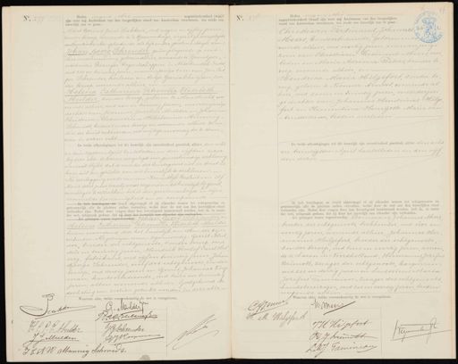 No. 277 Heden negenMei negentienhonderd twaalf, zijn voor mij Ambtenaar van den burgerlijken stand van Amsterdam verschenen, ten einde een huwelijk aan te gaan: Albert Berent Jans Rrakken oud negen en vijftig jaren zonder beroep wonende te 's- Gravenhage, ingevolge overgelegde authentieke akte optedende als bijzonder gevolmachtigde van Johan Georg Schreuder, geëmployeerde op eene thee onderneming, geboren alhier, wonende te Tjandjoer„ residentie Preanger-Regentschappen in Nederlandsch-Indi oud zes en twintig jaren, meerderjarige zoon van Jan Cas per Schrender, overleden en Antje Iserinkhuijsen zon der beroep, wonende alhier en Helena Catharina Petronella Elisabeth Mulder, zonder beroep, geboren te Maastricht, wo nende alhier, oud een en twintig jaren, meerderjarige dochter van Joannes Jacobus Mulder, en Johanna Christina Alexandrina Wilhelmina Munnig Schmidt, beiden zonder beroep en wonende alhier. De ou ders der bruid verklaarden, voor mij tegenwoordig toe te stem„ men in dezen echt De beide afkondigingen tot dit huwelijk zijn onverhinderd geschied, alhier den acht en twintigsten April laatstleden en den vijfden dezer Bij deze akte is tevens overgelegd een genieskundige verklaring waaruit blykt dat de moeder des Ruidegoms niet in staat is haar wil ten opzichte van dit huwelijk te verklaren. Na overlegging voorts van een Koninklijk Besluit van elf Maart dezes jaars waarbij wordt vergund om dit huwelijk bij gevol„ machtigde te voltrekken, heb ik den gevolmachtigde in zine voormelde hoedanigheid en de comparante Ik het bruidegem en bruid afgevraagd of zij elkander nemen tot echtgenooten en getrouwelijk alle de plichten zullen vervullen, welke door de wet aan den huwelijken staat verbonden zijn. Nadat deze vragen door hen bevestigend beantwoord werden, heb ik, in naam der wet, uitspraak gedaan, dat zij door het huwelijk aan elkander zijn verbonden dle getuigen waren tegenwoordig Johan Georg Schreuder en Helena Catharina Petronella Elisabeth Mulde beiden voornoemd, door het huwelijk aan elkander zin verbonden, Als getuigen waren tegenwoordig: Gerrit Mul der broeder der echtgenoote, zonder beroep, oud drie en twintig jaren, Hendrik Roelof Carel Hel weg, fabrikant, oud vijf en twintig jaren, Johan George Schreuder, neefdes echtgenoots, zonder beroep, oud dertig jaren en Gerrit Johannes Koof man, kantoorbediende, oud twee en twintig jaren, allen wonende alhier- Goedgekeurd de doorhaling van zestien gedrukte woorden in deze akte Waarvan akte, welke overeenkomstig, de wet is voorgelezen. No. 270 Heden negen Mei negentienhonderd twaalf zijn voor mij Ambtenaar van den burgerlijken stand van Amsterdam verschenen, ten einde een huwelijk aan te gaan: Christiaan Ferdinand Johannes 39„ Meers, kantoorbediende, geboren en wonc„ nende alhier, oud veertig jaren meerderjarige zoon van Christiaan Ferdinand Meers, over leden en Maria Adriana Peeters, zonder be roep wonende alhier en Hendrica Maria Hilgefort zonder be roep, geboren te Nieuwer- Amstel, wonende al hier oud zeven en twintig jaren, meerderjari ge dochter van Johannes Hendricus Hilge fort en Clementina Henrijette Maria van Amsterdam, beiden overleden De beide afkondigingen tot dit huwelijk zijn onverhinderd geschied, alhier den acht en twintigsten April laatstleden en den vijf den deze Ik heb bruidegom en bruid afgevraagd of zij elkander nemen tot echtgenooten en getrouwelijk alle de plichten zullen vervullen, welke door de wet aan den huwelijken staat verbonden zijn. Nadat deze vragen door hen bevestigend beantwoord werden, heb ik, in naam der wet, uitspraak gedaan, dat zij door het huwelijk aan elkander zijn verbonden Als getuigen waren tegenwoordig: Bernardus Johannes Meers broeder des echtgenoots, boekhouder, oud vier en veertig jaren, wonende alhier, Johannes Her manus Hilgefort, broeder der echtgenoote zonder beroep, oud twee en veertig jaren, wonen de te Laren in Noordholland, Hermanus Jozefus Brunott, zwager der echtgenoote, koopman; oud zes en dertig jaren en Ludovicus Maria Jozefus Tamiman, zwager des echtgenoots handelsreiziger, oud zes en veertig jaren, beiden wonende alhier. Waarvan akte, welke overeenkomstig de wet is voorgelezen. 40 Takten G. Mulder WRC. Gelina HOO