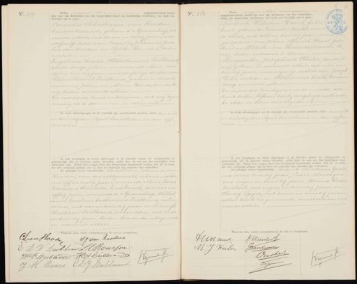 No. 279 Heden negenbei negentienhonderd twaalf zijn voor mij Ambtenaar van den burgerlijken stand van Amsterdam verschenen, ten einde een huwelijk aan te gaan: Cornelis Sebastiaan van Rooden, kantoorbediende, geboren te s- Gravenhage, wo nende alhier, oud zeven en dertig jaren, meer derjarige zoon van Cornelis Johannes Jaco bus van Rooden en Sijtske Rienstra, beiden overleden, en Engelina Lucia Wilhelmina Leibbrand, zonder beroep, geboren en wonende alhier oud vijf en twintig jaren, meerderjarige dochter van Willem Frederik Leibbrand, grossier in vleesch waren en Johanna Maria Bense, zonder be roep, beiden wonende alhier. De ouders der bruid verklaarden, voor mij tegen„ woordig, toe te stemmen in dezen echt- De beide afkondigingen tot dit huwelijk zijn onverbinderd geschied, alhier den acht en twintigsten April laatstleden en den vijf„ den dezer Ik heb bruidegom en bruid afgevraagd of zij elkander nemen tot echtgenooten en getrouwelijk alle de plichten zullen vervullen, welke door de wet aan den huwelijken staat verbonden zijn. Nadat deze vragen door hen bevestigend beantwoord werden, heb ik, in naam der wet, uitspraak gedaan, dat zij door het huwelijk aan elkander zijn verbonden. Als getuigen waren tegenwoordig: Sebastiaan Johannes van Rooden, oom des echtgenoots, schoenmaker oud vijf en zestig jaren, wonende alhier Lucas Ever ardus Ronssou, huisknecht oud vier en vijftig jaren, wonende te 's Gravenhage, Wilhel„ mus Carolus Anthonius Leibbrand, veehar delaar, oud vier en twintig jaren en Lodewijk Christiaan Leibbrand, veehandelaar oud twee en twintig jaren, beiden broeder der echtgenoote en wonende alhier No. 280 Heden negen Mei negentienhonderd twaalf zijn voor mij Ambtenaar van den burgerlijken stand van Amsterdam verschenen, ten einde een huwelijk aan te gaan: Friedrich Wilhelm Haust, fabri5 kant, geboren te Nieuwer-Amstel wonen de alhier, oud acht en twintig jaren meerder jarige zoon van Johan Henrich Haust, fabri kant en Wilhelmina Theuerzeit, zonder be„ roep beiden wonende te Baarn en Margaretha Josephine Weiler zonder be roep, geboren en wonende alhier oud vier en twintig jaren, meerderjarige dochter van Joseph Weiler, overleden en Wilhelmine Dietz zonder beroep, wonende alhier. De ouders des bruidegoms en de moeder der bruid hebben, blijkens hierbij overgelegde authentie ke akten in dezen echt toegestemd De beide afkondigingen tot dit huwelijk zijn onverhinderd geschied, alhier den acht en twintigsten April laatstleden en den vijfden dezer Ik heb bruidegom en bruid afgevraagd of zij elkander nemen tot echtgenooten en getrouwelijk alle de plichten zullen vervullen, welke door de wet aan den huwelijken staat verbonden zijn. Nadat deze vragen door hen bevestigend beantwoord werden, heb ik, in naam der wet, uitspraak gedaan, dat zij door het huwelijk aan elkander zijn verbonden. Als getuigen waren tegenwoordig: Frederik Christiaan Geisler oud zes en twintig jaren, Isaac Montagne oud negen en twintig jaren Berend Pieter Oudkerk, oud negen en twintig jaren en Hartog Spijer, oud zeven en twintig jaren allen klerk ter gemeente- secretarie en wo nende alhier. Waarvan alte welke overeenkomstig de wet is voorgelezen. Waarvan akte, welke overeenkomstig de wet is voorgelezen. S J van Rooden C van Rooden E H W Leibbran LE Rousjer Wijenste WF: Leiblram HA Berbbram J.H Bense CLJ Letduand rvan akte, v NMnanst: Aelserslert Waarlyne MJ. Weiber Onber Wernb J