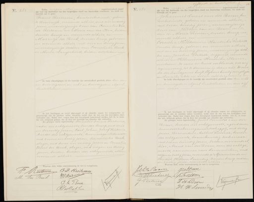 283 Heden negen Mei negentienhonderd twaalf zijn voor mij Ambtenaar van den burgerlijken stand van Amsterdam verschenen, ten einde een huwelijk aan te gaan: Frans Reitema, kantoorbediende, geboren te Beverwijk, wonende alhier, oud vier en dertig jaren, meerderjarige zoon van Cornelis Dou we Reitema en Maria van der Kaa, beiden zonder beroep en wonende alhier en Marretje ter Beek zonder beroep, geboren en wonende alhier, oud vier en dertig jaren meerderjarige dochter van Cornelis ter Beek en Maria Langerhorst, beiden overleden— De beide afkondigingen tot dit huwelijk zijn onverhinderd geschied, alhier den een en twintigsten en acht en twintigsten April- laatstleden Ik heb bruidegom en bruid afgevraagd of zij elkander nemen tot echtgenooten en getrouwelijk alle de plichten zullen vervullen, welke door de wet aan den huwelijken staat verbonden zijn. Nadat deze vragen door hen bevestigend beantwoord werden, heb ik, in naam der wet, uitspraak gedaan, dat zij door het huwelijk aan elkander zijn verbonden. Als getuigen waren tegenwoordig: Cornelis Douwe Reitema vader des echtgenoots zonder beroep, oud drie en zeventig jaren, Carl Johan Jozef Reitema broeder des echtgenoots tramwagenbestuurde oud zeven en dertig jaren, Cornelis ter Beek slager, oud twee en veertig jaren en Cornelis Elbert ter Beek slager, oud negen en dertig jaren, beiden broeder der echtgenoote, allen wonende alhier No. 284 vijftigste en laatst Heden negen ebei negentienhonderd twaal zijn voor mij Ambtenaar van den burgerlijken stand van Amsterdam verschenen, ten einde een huwelijk aan te gaan: Johannes Lucas van der Boom kan toorbediende, geboren en wonende alhier oud zes en twintig jaren, meerderjarige zoon van Willem van der Boom overle den en Maria Prinsen, zonder beroep, wo nende alhier, en Cornelia Willemina Hendrika Pietersz zonder beroep, geboren en wonende alhier oud een en twintig jaren meerderjarige doch ter van Jacobus Pietersz suppoost wonende alhier en Willemina Hendrika Imer„ overleden. De vader der bruid verklaarde voor mij tegenwoordig, toe te stemmen in dezen echt. De moe der des bruidegoms heeft, blijkens hierbij overgelegde authentieke akte in dezen echt toegestemd De beide afkondigingen tot dit huwelijk zijn onverhinderd geschied, alhier den acht en twintigsten April laatstleden en den vijf den dezer Ik heb bruidegom en bruid afgevraagd of zij elkander nemen tot echtgenooten en getrouwelijk alle de plichten zullen vervullen, welke door de wet aan den huwelijken staat verbonden zijn. Nadat deze vragen door hen bevestigend beantwoord werden, heb ik, in naam der wet, uitspraak gedaan, dat zij door het huwelijk aan elkander zijn verbonden. Als getuigen waren tegenwoordig: Jacob Cornelis van der Boom broeder des echtgenoots, agent eener levensverzekeringsmaatschappij, oud dertig jaren Bernardus Aalbert Pietersz, broeder der echtgenoote bouwkundig teekenaar oud zes en twintig jaren, beiden wonende al hier Arend van der Boom, oom des echtge noots, aannemer van bouwwerken oud negen en zestig jaren wonende te '’s Gravenzande en Hendrik Willem Levendag, zonder beroep, oud een en zestig jaren, wonende alhier Waarvan akte, welke overeenkomstig de wet is voorgelezen. Waarvan akte, welke overeenkomstig de wet is voorgelezen. GD. Rectemel He Reitema AWetern M. ter Beek C. te Beek Na GTerech JohrL va Boom J Cvd Boom AHieterszBAjetern ieumelenJr J Pieteuss A vd Boom H W Levendag