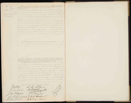 duee No. 283 Waarnemend Vorreitter. zijde. „ Heden negen Mei negentienhonderd twaalf zijn voor mij Ambtenaar van den burgerlijken stand van Amsterdam verschenen, ten einde een huwelijk aan te gaan: Willem de Haas, kantoorbediende, geboren en wonende alhier, oud zes en twintig jaren, meerderjarige zoon van Jan de Haas koop man en Antje Mellenbergh, zonder beroep beiden wonende alhier, en Erlanda van Driel, zonder beroep, gebo„ ren en wonende alhier, oud drie en twintig jaren, meerderjarige dochter van Dirk van Driel melkslijter en Maria Magdalena Allart, zonder beroep, beiden wonende alhier Beider ouders verklaarden voor mij tegenwoordig„ toe te stemmen in dezen echt. De beide afkondigingen tot dit huwelijk zijn onverhinderd geschied, alhier den acht en twintigsten April laatstleden en den vijf„ den dezer Ik heb bruidegom en bruid afgevraagd of zij elkander nemen tot echtgenooten en getrouwelijk alle de plichten zullen vervullen, welke door de wet aan den huwelijken staat verbonden zijn. Nadat deze vragen door hen bevestigend beantwoord werden, heb ik, in naam der wet, uitspraak gedaan, dat zij door het huwelijk aan elkander zijn verbonden. Als getuigen waren tegenwoordig: Derk Slestenaar, Zwager des echtgenoots, boekhouder, oud negen en der tig jaren, wonende te Stad-Almelo, Jan de Haas broeder des echtgenoots, winkelier oud vier en dertig jaren, Johan George van Driel, oom der echtgenoote, kellner, oud drie en vijftig jaren en Hendrik Willem Frederik van Driel, broeder der echtgenoote chauffeur oud vijf en twintig jaren, allen wonende al he arvan akte, welke overeenkomstig de wet is voorgelezen. Wde Harr M M, Alart D Hittenaer 12 E van Driel 7 J. de Haas J: A: Han Jr A Mellenbergh J. J. van Duel P Van Druel H.W.F van Driel
