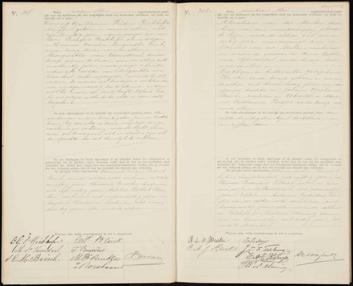 fo 307. Heden negen Mei negentienhonderd twaalf zijn voor mij Ambtenaar van den burgerlijken stand van Amsterdam verschenen, ten einde een huwelijk aan te gaan: Conrad Guillaume Frédéric Kickhefer, chauffeur, geboren en wonende alhier oud zesentwintig jaren, meerderjarige zoon van Pierre François Kickhefel diamantslyper en Susanna Cornelia Margaretha Brink„ zonder beroep, beiden wonende alhier en— Margaretha van Verzendaal, zonder beroep, geboren te Leiden, wonende alhier oud eenentwintig jaren, meerderjarige erkende natuurlijke dochter van Margaretha van Verzendaal, ziekenverpleegster wonende te Hil versum. De moeder des bruide goms verklaarde; voor mij tegenwoordig toe te stemmen in dezen echt. De moeder del bruid heeft, blijkens hier bij overgelegde authentieke akte, in dezen echt toegestemd. De beide afkondigingen tot dit huwelijk zijn onverhinderd geschied, alhier den veertienden en eenentwintigsten Januari laatst„ leden. Bij deze akte is tevens overgelegd eene ge„ nieskundige verklaring, waaruit blijkt, dat de vader des bruidegoms niet in staat is zijn wil ten opzichte van dit huwelijk te verklaren. Ik heb bruidegom en bruid afgevraagd of zij elkander nemen tot echtgenooten en getrouwelijk alle de plichten zullen vervullen, welke door de wet aan den huwelijken staat verbonden zijn. Nadat deze vragen door hen bevestigend beantwoord werden, heb ik, in naam der wet, uitspraak gedaan, dat zij door het huwelijk aan elkander zijn verbonden. Als getuigen waren tegenwoordig: Coemraad Willem Frederik Brink, oom des echtgenoots, werkman, oud drie, envyftig jaren, Theodorus Bruscher, koopman oud vyfenzestig jaren, Melchior Kolkert Ben„ ken, werkman, oud negenenzestig jaren en Engbert Rozeboom, werkman, oud vieren, zeventig jaren, allen wonende alhier. Heden veertien Mei negentienhonderd twaalf zijn voor mij Ambtenaar van den burgerlijken stand van Amsterdam verschenen, ten einde een huwelijk aan te gaan: Abraham van der Meulen, direc teur van eene maatschappy, geboren te zijpe, wonende alhier, oud zevenen dertig jaren, meerderjarige zoon van Cornelis van der Meulen, makelaar in onroerende goederen en Anna Catha rina Sijbecarspel, zonder beroep, beiden wonende alhier en Catharina Antoinette Josephine Henke, zonder beroep, geboren en wonen de alhier, oud tweeëndertig jaren, meer der jarige dochter van Johann Gerhard Henke, overleden en Ubaldina Adria na Catharina Kersjes, zonder beroep, wo nende alhier.— De beide afkondigingen tot dit huwelijk zijn onverhinderd geschied, alhier den achtentwintigsten April laatstleden en den vijfden dezer, Ik heb bruidegom en bruid afgevraagd of zij elkander nemen tot echtgenooten en getrouwelijk alle de plichten zullen vervullen, welke door de wet aan den huwelijken staat verbonden zijn. Nadat deze vragen door hen bevestigend beantwoord werden, heb ik, in naam der wet, uitspraak gedaan, dat zij door het huwelijk aan elkander zijn verbonden. Als getuigen waren tegenwoordig: Johann Anton Heinrich Siebers handelsagent oud vijftig jaren, Jan Thomas Ferdinand Telting rechter in eene arrondissements Rechtbank, oud zesenveertig jaren, Wilhelmus Antonius Egbertus Kers jes, oom der echtgenoote, winkelier, oud tweeenzestig jaren, allen wonende alhier en Wilhelmus Nicolaas Klaming, aanne mer van bouwwerken, oud zestig jaren, wi nende te Medemblik. Waarvan akte, welke overeenkomstig de wet is voorgelezen. n akte, welke overeenkomstig de wet is voorgelezen. CWt: B lirk C.C. F. Riekkefer (M v. Verendaal J: Bruierer M F Reuken Brevee J.C M Brink. a Horeboom A. de O eilen. Jutiekeer C. A. J. Henke J.T. F. Teeting. Vawotende V E Henen WWWC bleening