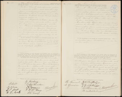 501 Heden tien Juli negentienhonderd twaal zijn voor mij Ambtenaar van den burgerlijken stand van Amsterdam verschenen, ten einde een buwelijk aan te gaan: Bertus Smit, schuitevoerder, geboren en wonende alhier, oud drieentwintig jaren, meerderjarige zoon van Johan Christiaan Smit metaaldraaier en Leo„ poldina Eckart, zonder beroep, beiden wonende alhier en Maria Magdalena Even, zonder be roep, geboren en wonende alhier oud twintig jaren, minderjarige dochter van Frederik Wilhelmus Hendricus Even, overleden en Grietje Voorbrug winkelierster wonende alhier. De ouders des bruidegoms en de moeder der bruid verklaarden, voor mij tegenwoordig, toe te stemmen in dezen echt- De beide afkondigingen tot dit huwelijk zijn onverhinderd geschied, alhier den dertigsten Juni laatstleden en den zeven„ den dezer. De bruid verklaarde mij de identi teit haars vaders, wegens naamsverschil in de overgelegde stukken Ik heb bruidegom en bruid afgevraagd of zij elkander nemen tot echtgenooten en getrouwelijk alle de plichten zullen vervullen, welke door de wet aan den huwelijken staat verbonden zijn. Nadat deze vragen door hen bevestigend beantwoord werden, heb ik, in naam der wet, uitspraak gedaan, dat zij door het huwelijk aan elkander zijn verbonden. Als gebuigen waren tegenwoordig: Cornelis Schuitemaker zwager der echtgenoote, trannconducteur oud zesendertig jaren, Henricus Even, pakhuis„ knecht, oud dertig jaren, Frederik Wilhelmus Henricus Even, sigarenmaker oud vijfen twintig jaren, beiden broeder der echtgenoote en Ferdinand Albertus Teunisse, horlogema„ ker, oud vyfentwintig jaren, allen wonende alhier Waarvan akte, welke overeenkomstig de wet is voorgelezen. No. 502. Heden tien Juli negentienhonderd twaalf zijn voor mij Ambtenaar van den burgerlijken stand van Amsterdam verschenen, ten einde een huwelijk aan te gaan: Barend Kuvel, gasfitter, geboren en wonende alhier, oud- drieenvyftig jaren, van echt ge, 8 scheiden echtgenoot van Wijtske Ianja, meerderjarige zoon van Hen drik Kuvel en Petranella Vervooren beiden overleden en Antonette Gerritze, zonder beroep geboren te Zwolle, wonende alhier oud drieenviftig jaren, weduwe van Johannes Rudolph de Vries, meerderjarige dochter van Antony Gerritze en Willemina Margaretha Harreveld, beiden overleden De beide afkondigingen tot dit huwelijk zijn onverhinderd geschied, alhier den dertigsten Juni laatstleden en den ze„ venden dezer, Ik heb bruidegom en bruid afgevraagd of zij elkander nemen tot echtgenooten en getrouwelijk alle de plichten zullen vervullen, welke door de wet aan den huwelijken staan verbonden zijn. Nadat deze vragen door hen bevestigend beantwoord werden, heb ik, in naam der wet, uitspraak gedaan, dat zij door het huwelijk aan elkander zijn verbonden. ds gebuigen waren tegenwoordig: Johannes Nicolaas van Voorthuyzen zwager der echtgenoote werk man, oud eenenzestig jaren, Gerardus Jo„ hannes Schildweijer, gasfitter, oud negenen veertig jaren, Pieter Ruisendaal zonder beroep oud vijfenvijftig jaren en Hermanus Kolbet kink schoonzoon des echtgenoots, gasfitter oud tweeendertig jaren, allen wonende alhier Waarvan ette wolke ve venkwintig de wet G. Voorbrug Behrit P. Schuitemaker Mnel M.M. Even. H Even I C Smst F W.H. Oven E J had F:A: Teemrisse Waarvan akte, welke overeenkomstig de wet is voorgelezen. B Kunel Je: Voorkuigen C a A Gerritze J/ Schelmeijsen Pe Priniaandan Mhohnde H. Volbekhek