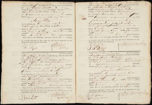 Den Zeven Apintiesten Mei Ao. 1800 zeventien, ten twaalf ure, op den middag, is ingeschreven, het AFSTERVEN van Maria Twint. Overleden den vier etwintigsten dezer ten Elf ure, des avonds ouden Een half Jaren, wonende Heisterg No. 6 Kanton 3, en dldaar overleden, Geboren Amsterdam, Johannes Twint Alida Post Op de verklaring van bovengemelde vader oud agtedertig Jaren, wonende als boven Beroep Melkverkoper van de Overledene, en van Jacobus Meijer oud zesendertig Jaren, wonende Pinceagt, & 600 Beroep Hoedistoffender bekende van de Overledene, Deze Acte is, na voorlezing, geteekend door de Eeide Getuige, en bevestigd ingevolge de Wet, door mij, Lid van de Kommissie tot den Burgerlijken Stand der Stad Amsterdam. Jan twint CBarker de Sorge Js Meijer J. ba JJ04an f Den Zevenstientigsten Mei Ao. 1800 zeventien ten twaall tare, op den middag, is ingescheven, het AFSTERVEN, van Jalonton Magnus Dendring Overleden den vijfe twintigsten dezer ten vijf ure, tes nogt oud agt zesfentig Jaren, wonende Muidergragt No No. 5 Kanton en aldaar Geboren Amsterdan weduwenaar van Tiette Salomons, verden niet beken Op de verklaring van Dion Jatnuel Pinto oud zeeentwintig Jaren, wonende Kerkstraat 2 12 Beroep Koopmanheef van de Overledene, en van Jacob Secre de Vrus oud vijfetwintig Jaren, wonende als boven 14 Beroep als bovenbekende van de Overledene, Deze Acte is, na voorlezing, geteekend door de beeide Getuige, en bevestigd ingevolge de Wet, door mij, Lid van de Kommissie tot den Burgerlijken Stand) der Stad Amsterdam. Bacher de Bonje L: S: Tinto J: L: Deerig Den Zeven etwintigsten Mei Ao. 1800 zeventien, tentwaalf dre, op, den middag, is ingeschreven, het AFSTERVEN van Wogel Tsaal Overleden den vijftwintigsten dezer ten drie ure, des nagt Oud Een vijftig Jaren, wonende Anthonies breestroat No. 35 Kanton 1, en aldaar overleden, Geboren Amsterda gehuwd het Camuel KEeizer verders niets bekael Op de verklaring van Jacob Tiaac Lint oud agtveertig Jaren, wonende als boven Beroep vindventerzwager van de Overledene, en van Jacob Jaac Agttienribde oud agtzestig Jaren, wonende Mark N8 Beroep SBrunijer bekende van de Overledene, Deze Acte is, na voorlezing, geteekend door de Eerste Getuige verklarende de bwede niet te kunnen schijven en bevestigd ingevolge de Wet, door mij, Lid van de Kommissie tot den Burgerlijken Stand der Stad Amsterdam. CBarker de Jong Izik Lent Den Zeventwintigsten Mei A. 1800 zeventien, ten twaal fure, op den tiddag, is ingeschreven, het AFSTERVEN, van Fredrik Hannis Overleden den Zestwintigsten dezer ten Een ure, des middal oud zes Jaren, wonende Kareine UdrechtiepoorZ No. — Kanjon 3, en aldaar overleden, Geboren Schriesteinfeld van Jacob Aannu Johanna Strikkerin Op de verklaring van bovengemelde Vader¬ oud vierendertig Jaren, wonende als boven. Beroep landbouer van de Overledene, en van Johan Veorg Meijer oud tweeendertig Jaren, wonende als boven Beroep bikkerbekend van de Overledene, Deze Acte is, na voorlezing, geteekend door de beeide Getuige, en bevestigd ingevolge de Wet, door mij, Lid van de Kommissie tot den Burgerlijken Stand der Stad Amsterdam C Backer de San Jacob Hamn Josana Gron Wnor