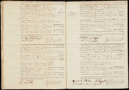 J Den dertienden Augustus Ao. 1800 reventien, ten twaalf ure, op den middag, is ingeschreven, het AFSTERVEN, van Godbieb Laurens Feiskorn Overleden den Elfden dezer ten vijf ure, des middag oud zegen envijftig Jaren, wonende Prinsengracht overleden, No. 765 Kanton 3, en aldaar Geboren te amsterdam van beroep Murick mee,sten gehuwd met Cornelia Hillegonda Meger Toussant Op de verklaring van Fredrik Hendrik Van der Kop oud acht endertig Jaren, wonende haarlemmerryk N 101 Beroep advicaat en Nif van de Overledene en van Jan Bantjes GerritsJoon oud drie en veertig Jaren, wonende prinsengracht No 600 Beroep winkelier in Neef van de Overledene Deze Acte is, na voorlezing, geteekend door de beide Getuige en bevestigd ingevolge de Wet, door mij, Lid van de Kommissie tot den Burgerlijken Stand der Stad Amsterdam. P: H van der Kopp ten Sande J: Bantjes Gezn Den dertienden Augustus Ao. 1800 zeventien, ten twaalf ure, op den middag, is ingeschreven, het AFSTERVEN van Geesje Lweers Overleden den twaalfdendezer ten tien ure, des mogens oud vijfenzeventig Jaren, wonende korte Keuesstraat No. 28 Kanton 1, en aldaar overleden, Geboren in den han on overysel ongehuwd dochi van Jannes Zweeis en Hermyntje Jansstue Op de verklaring van Hendricus Butter oud twee en twintigJaren, wonende als boven Beroep broodbakken en Neef van de Overledene, en van Jacob van Pol oud dertig Jaren, wonende alsboven N 22 Beroep blikslager en bekende van de Overledene, Deze Acte is, na voorlezing, geteekend door de biide Getuige, en bevestigd ingevolge de Wet, door mij, Lid van de Kommissie tot den Burgerlijken Stand der Stad Amsterdam. H Buter Gete San der J: van Tol Den dertienden Augustus ten twaarfure, op den middag, is ingeschreven, het AFSTERVEN van Anna Maria Carolina Scholmeyjer Overleden den twaalfden dezer ten negen ure, des woordens oud acht Jaren, wonende tweede Rozendwarsstraat No. 21 Kanton 5, en aldaar overleden, Geboren Amsterdam van Hendrik Philip Scholmeijer en Anna Maria Catharina Rembach. Op de verklaring van boven gemelde vader oud negen en dertig Jaren, wonende als boven Beroep suikerbakkersknecht van de Overledene, en van Hendrik Stoekenbroek oud een en veertig Jaren, wonende Lauriagracht N 64 Beroep geen en bekende van de Overledene, Deze Acte is, na voorlezing, geteekend door de beide Getuige en bevestigd ingevolge de Wet, door mij, Lid van de Kommissie tot den Burgerlijken Stand der Stad Amsterdam. Herrich Philip Scholmens G: Een Sande Hendrik: Hoekenbroek