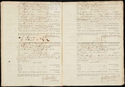 Den Achtsten Augustus Ao. 1800 zeventien, ten tiegg ure Vook den middag, is ingeschreven, het AFSTERVEN van Alexander Franciscus Beukman Overleden den Zevenden dezer ten zeken ure, des morgens oud twee Jaren, wonende Warmoestraat No. 21Kanton 2, en aldaar overleden, Geboren Amsterdam van Franciscus Wesselleus. Josephus Reukman PPetronella Libotte Op de verklaring van Alexander Heyman oud vierentwintig Jaren, wonende kolveniersburgwal Beroep Winkelier: K oom van de Overledene, en van Godfried wastman oud veertig Jaren, wonende besijde de groote zal N 21 Beroep kledermakersknegt& bekende van de Overledene. Deze Acte is, na voorlezing, geteekend door de beide Getuige, en bevestigd ingevolge de Wet, door mij, Lid van de Kommissie tot den Burgerlijken Stand der Stad Amsterdam. Backerde vorge A: Heeman G: Wustman Den Achtsten duguttus AAo. 1800 zeventien, ten Elf ure voor den middag, is ingeschreven, het AFSTERVEN, van Telles, Donker Overleden den vifden dezer ten zes ure, des avonds„ oud vier Jaren, wonende loiersgracht No. 5 Kanton 11, en aldaar overleden, Geboren Amsterdam. van Gerrit. Donken en Catharina Huboo. - Ingevolge Proces verbaal in dato. den zesden deze van Ovde vendengnn het aalmoeseniersweeshuis. —Jaren, wonende oud van de Overledene, Beroep: en van . Jaren, wonende van de Overledene. Beroep. Deze Acte is, na voorlezing, geteekend door de Getuige, en bevestigd ingevolge de Wet, door mij, Lid van de Kommissie tot den Burgerlijken Stand der Stad Amsterdam. C Backerde Sore Den Achtsten Augu Dus Ao. 1800 zeventen, ten tien ure, voor den middag, 5 ingeschreven, het AFOTERVEN van Rynier Lambregis Overleden den inden Jaren 1800 twaalf ure, des oud Jaren, wonende No. Kanton, en te Smolensko. overleden, Geboren — Zijnde, de te Inschrijving gedaan Ingevolge dispotietie van de regtbarik van aanleg, zitting hebbende alhier. in dato den 30e July 1800 zesventien Op de verklaring van oud Jaren, wonende van de Overledene, Beroep O Jaren, en van O wonende van de Overledene. Beroep Deze Acte is, na voorlezing, geteekend door: de Getuige, en bevestigd ingevolge de Wet, door mij, Lid van: de Kommissie tot den Burgerlijken Stand der Stad Amsterdam. CBarker de Torge Den Achtsten Augustus Ao. 1800 zeventien, ten Elf ure voor den widdag, is ingeschreven, het AFSTERVEN, vanHendrik Stamer Overlegen den vijfden dezer ten twee ure, de morgens. oud Eenen ten half Jaren, wonende Foelystraat No. 38kanton ., en aldaar overleden, Geboren Amsterdam. ouders onbekend Ingevolge Proces. verbaal in dato den Zesden dezer sen het aalnoeseneisteeshuis. Op de verklaring van Jaren, wonende oud. — van de Overledene, Beroep Jaren, en van wonende van de Overledene. Beroep Deze Acte, is, na voorlezing, geteekend door de Getuige, en bevestigd ingevolge de Wet, door mij, Lid van de Kommissie tot der Burgerlijken Stand der Stad Amsterdam. CBarker de Sons