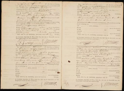 Beroep van de Overledene. Deze Acte is, na voorlezing, geteekend door de Getuige en bevestigd ingevolge de Wet, door mij, Lid van de Kommissie tot den Burgerlijken Stand der Stad Amsterdam Alsdamme Coll Berk kleik Den Zestienden Maart Ao. 1800 Een-en-Twintig ten twee ure, na den middag, is ingeschreven, het AFSTERVEN, van Anna Hendrika Schreuder Overleden den dertienden dekw ten negen ure, des monnen oud drientwintig Jaren, wonende Binnenghuis No. — Kanton , en aldaar overleden, Geboren Alhier Naaister Ongehuwd dogtw van Johan fredrik Schiender en Hendrika Groll Ingevolge From Verbaal in dato heden van Geon: hunn de Overledenc heeft— onroerende Goederen nagelaten .- achterlating van Kind Op de verklaring van Gud Jaren, wonende Beroep van de Overledene, en van oud. Jaren, wonende Beroep van de Overledene. Deze Acte is, na voorlezing, geteekend door de Getuige, en bevestigd ingevolge de Wet, door mij, Lid van de Kommissie tot den Burgerlijken Stand der Stad Amsterdam ACManman