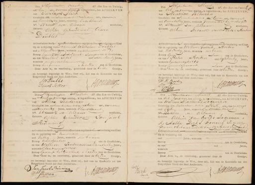 Den Negentienden Maart Ao. 1800 Een-en-Twintig, ten tien ure, voor den middag, is ingeschreven, het AFSTERVEN van Jan Iacob Klink Overleden den zestienend toten a drie ure, des meddags oud vierezeventig Jaren, wonende Oude schans No. 18 Kanton 1, en Aldaar overleden, Geboren Alhier gehuwd met Clara Doublet de Overledene heeft, onroefende Goederen nagelaten Zinnaehterlating van Kind Op de verklaring van Joannes Wilhelm Doublet oud NegendertJaren, wonende agterhuywal No71 Beroep geamb: van de NederLilank- zwager van de Overledene, en van Jacobus Teket. oud zevene zeventig Jaren, wonende In de overzedenimwr 13. Beroep koopman. bekende van de Overledene, Deze Acte is, na voorlezing, geteekend door de beide Getuige, en bevestigd ingevolge de Wet, door mij, Lid van de Kommissie tot den Burgerlijken Stand der Stad Amsterdam. JW Doublet AF van mtaz. Iacob Seket Den Negentienden Maart Ao. 1800 Een-en-Twintig1 ten Eef ure, voor den middag, is ingeschreven, het AFSTERVEN, van Hendrica Veltman Overleden den Zeventiendenderig ten twee ure, des nagt oud drieevijftig Jaren, wonende princenragt by motenpad No. 22Kanton Ben Aldaar overleden, Geboren alhier weduwe van Pieter Boeken de Overledene heeft onroerende Goederen nagelaten met achterlating van Kinden Op de verklaring van Willem fredrik Boeken oud viffendertig Jaren, wonende Inboven Zom van de Overledene Beroep geen en van Pieter Boeken oud agtentwintig Jaren, wonende keizermanto 13 Beroep Commissionair zoon van de Overledene Deze Acte is, na voorlezing, geteekend door de beide Getuige, en bevestigd ingevolge de Wet, door mij, Lid van de Kommissie tot den Burgerlijken Stand der Stad Amsterdam. W: F: Boeken ADCommein Bottuere Den Negentienden Maart Ao. 1800 Een-en-Twintig, ten tien ure, voorden middag, is ingeschreven, het AFSTERVEN van Alida Sinderam Overleden den Zeventienden derg ten twee ure, desmiddan oud zesenveertig Jaren, wonende Elandstraat No. 4Kanton 5, en aldaar overleden, Geboren alhier gehuwd met Tien Jacob Beuning de Overledene heeft I ohroerende Goederen nagelaten Lomachterlating van Kind Op de verklaring van Eenman oud vyftig Jaren, wonende tn boom Beroep aanspreker van de Overledene, en van Willem Zonderam oud vrienverftig Jaren, wonende Elandsgraat1. Beroep geamp: byt Grootboek broeder van de Overledene, Deze Acte is, na voorlezing, geteekend door de beide Getuige, en bevestigd ingevolge de Wet, door mij, Lid van de Konsmissie tot den Burgerlijken Stand der Stad Amsterdam. Jan Jacob Beuning AF: vonma W:= Jinderam tol Berk kerk Den Negentienden Maart Ao. 1800 Een-en-Twintig, ten Eef ure voor den middag, is ingeschreven, het AFSTERVEN, van Willem Martinus Logeman Overleden den agtienden dekm ten Vyff ure, des middags oud Vyf Jaren, wonende gezankerstraat No. 136 Kanton, en Aldaars overleden Geboren Alhier van Gerdt Logeman Aaltje Dirks Koning Ingevolge Proen verbaal in dato den 19 rocter van het Saalmoes: Whun de Overledene heeft —onroerende Goederen nagelaten achterlating van King Op de verklaring van oud Jaren, wonende Beroep van de Overledene en van Jaren, wonende van de Overledene Beroep Deze Acte is, na voorlezing, geteekend door de Getuige, en bevestigd ingevolge de Wet, door- mij, Lid van de Kommissie tot den Burgerlijken Stand der Stad Amsterdam. ALvanm