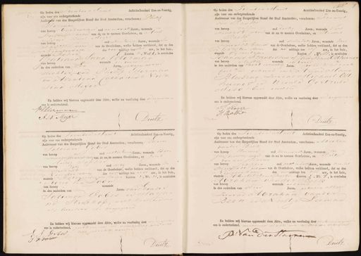 Op heden den Sienden daart Achttienhonderd Een-en-Veertig, „„ zijn voor ons ondergeteekende Ambtendar van den Burgerlijken Stand der Stad Amsterdam, verschenen: Philif German van beroep boehdrukker oud zenenveertig Jaren, wonende 1en Berfhuisd vader van de na te noemen Overledene, en Hrem saad Kaut Meyer van beroep oud zesentwintig Jaren, wonende st Fet 377 von van de Overledene, welke hebben verklaard, dat op den Negentinderen des voor middags ten ure, in het huis, staande Roken Kanton 1, No. 66, is overleden Gratranscharia Cllerman van beroep wonende als boven in den ouderdom van Ees Jaren, je voor alhier dochter van Philip Ellerman en Arendina Catharina Niela„ Sina Meyjer En hebben wij hiervan opgemaakt deze Akte, welke na voorlezing door de aangeversen ons is onderteekend. WEllerman A.S.K. Meijer. Deutz Op heden den Iienden Maart Achttienhonderd Een-en-Veertig, V zijn voor ons ondergeteekende Ambtenaar van den Burgerlijken Stand der Stad Amsterdam, verschenen: Francis us Kaske van beroep tapper oud dertig Jaren, wonende Guul Aaood 3 58 pou van de na te noemen Overledene, en Hendrik Kastie oud drie en zestig Jaren, wonende ker van beroep waal 132. behoed van de Overledene, welke hebben verklaard, dat op den schtsten dezer des na middags ten elf ure, in het huis, staande Vifersti cul Kanton 2, No. 33, is overleden Hannes Franciscus of Jan Frans Ostheimer van beroep Slaster wonende al boven in den ouderdom van acht enveertig Jaren, pooesen te Frank fort a/m gehuwd met Anna Maria Bleesing zon van Aichael Ost. heimer en Ursuld Gertrida Miso bude overlden. En hebben wij hiervan opgemaakt deze Akte, welke na voorlezing door de aanerss en ons is onderteekend. F: Passe H Raske Dutz. Op heden den Tienden Mant Achtienhonderd ZevenVeertig, zijn voor ons ondergeteekende Ambtenaar van den Burgerlijken Stand der Stad Amsterdam, verschenen: Eliazen Paloman Tobes van beroep zel oud achtentwintig Jaren, wonende Bara vierwvandertwann en wee van de na te noemen Overledene, en Jacob Cantog Saphier van beroep Das oud veertig Jaren, wonende 1 Gerstgaan van de Overledene, welke hebben verklaard, dat op den Vegenden dere des voormiddags ten acht ure, in het huis, staandeBatagierdigan stans Kanton 1, No. 1, is overleden geboren ten zoon van heroep wonende in den ouderdom van Jaren. CarEliazer Salemon Gobes en Marjan ne Stukkop, welk kindden ons als levenloos is. aangegeven En hebben wij hiervan opgemaakt deze Akte, welke na voorlezing door de renjeo ons is onderteekend, goeskeunenee de doorzaling van acht Tobes, tien jedrakte woorden J: H: Saphur Deutz. Op heden den Tienden Maart Achtienhonderd Een-enVeertig, zijn voor ons ondergeteekende Ambtenaar van den) Burgerlijken Stand der Stad Amsterdam, verschenen: Alra van van der Beet van beroep Karman oud zevenenentig Jaren, wonende ten sterbruen vader van de na te noemen Overledene, en Pieter van der Stavren van beroep schippen oud achten testigaren, wonende amsti Straatje 10. gebruun van de Overledene, welke hebben verklaard, dat op den Negender dezer des vorrmiddags ten tien ure, in het huis staandeMmitelstraat korte Kanton 2, No. 8, is overleden Abraham van der Beek wonende al boven van beroep in den ouderdom van Arie Jaren, eebozen alhier Zoonvan Abraham van der Beek en Neeltje Leeman En hebben wij hiervan opgemaakt deze Akte, welke na voorlezing door den tweeden denjever en ons is onderteekend. verkluring de eerste niet te kunnen schryven P: Van der Stagvan Deutz