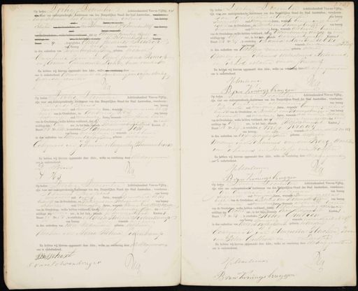 Op heden Dertig December Achttienhonderd Vier-en-Vijftig, is zijn door ons opdergeteekende Ambtenaar van den Burgerlijken Stand der Stad Amsterdam, verschenen: Engeschreven het Onderstaande, volgens van beroep 7 daren ne en van Boemendaal 27 dceember 1854 van beroep Clissive van d v voren van de Overledene, welke hebben verklaard, dat op drieentwintig dezer des. millage ten ure, in het hur staande te Bloemendal Kanton Buut A, is overleden Carel Frederik Reurop van beroep geen wonende en in den ouderdom van zesentwintig Jaren, geboren alhier Ongehuwd, zoon van Carel frederik Reurop en Anna Gerurdina Lichte, beide overleden En hebben wij hiervan opgemaakt deze Akte, welke -da voorlezing door ons is onderteekend. Goedkeurende de doorhaling van vyf en dertig gedrukte woorden 1/0 Op heden Dertig December Achttienhonderd Vier-en-Vijftig zijn voor ons ondergeteekende Ambtenaar van den Burgerlijken Stand der Stad Amsterdam, verschenen: Jan Cristiaan Mollemaan van beroep Suppoort oud negenenveertig Jaren, wonende binnengasthuis binmar van de Overledene, en Bertus van Koningsbruggen van beroep bediende oud vierentwintig Jaren, wonende als boven, bekende van de Overledene, welke hebben verklaard, dat op vierentwintig dezer des voor middags ton Elf ure, in het huis, staande achterburgwalf Kanton 1 Buurt B No. 317, is overleden Johanna Maria Lubke wonende haar lemmerdyn P497 van beroep in den ouderdom van Achttien maanden geboren alhier dochter van Johannes Wilhelmus Antonius, en Jophia Maria van der Sanden En hebben wij hiervan opgemaakt deze Akte, welke na voorleting door de aangevers en ons is onderteekend. HHoeleman W Op heden Dertig December Achttienhonderd Vier-en-Vijtig, zijn voor ons ondergeteekende Ambtenaar van den Burgerlijken Stand der Stad Amsterdam, verschenen: van beroep Dirk Prins metselaar oud Eenenewintig Jaren, wonende Arinsengracht hh 273 nert van de Overledene, en Andriee Nos. van beroep bediende oud vierentwintig Jaren, wonende Sterfhuis, zoon van de Overledene, welke hebben verklaard, dat op hereen 2 des voor middags ten Een ure, in het huis, staande Rorteleidscheetwarsstraat Kanton 2, „ Buurt I No. 142, is overleden Harmanus Pos van beroep metsehaar wonende als boven in den ouderdom van tveeenviftig Jaren geboren alhier of Echtgenoot van Johanna Margaretha Theunenbroek En hebben wij hiervan opgemaakt deze Akte, welke na voorlezing door bultangevors en ons is onderteekend. Prins IMG J3 Kyven Jan Op heden Dertig December Achttienhonderd Vier-en-Vijftig, zijn voor ons ondergeteekende Ambtenaar van den Burgerlijken Stand der Stad Amsterdam, verschenen: an Eristiaan Moeleman van beroep Tappoost oud negenveertig Jaren, wonende binnen gasthud bekende van de Overledene, en Bertus van Koningsbruggen van beroep bediende oud vierentwintig Jaren, wonende als boven bekende van de Overledene, welke hebben verklaard, dat op Negenentwintig aezer des voor middags ten vier ure, in het huis, staande, achtburgval Kanton 1 Buurt B No. 34, is overleden Antje Kraai van beroep geen wonende Anjelierstraat Oo 353 in den ouderdom van vijfenzeventig Jaren geboren actigen Weduwe van Johannes van den Berg, dochter van Johannes en Roelofje van Hogten En hebben wij hiervan opgemaakt deze Akte, welke na voorlezing door diaangeversen ons is onderteekend. HMoellman Viig Dertig December Achttienhonderd Vieren-Vijtig, 1 zijn voor ons ondergeteekende Ambtenaar van den Burgerlijken Stand der Stad Amsterdam, verschenen van beroep Johannes Bosschert werkman oud viftig Jaren, wonende Yzenstraat U 263 bekendee van de Overledene, en Philippus van Schoondrager van beroep schilder oud achtenvijftig Jaren, wonende bloemgracht dd 162 bekende van de Overledene, welke hebben verklaarddat op Negenentwintig dezer des voor middags ten zeven ure, in het huis, staande Laurigrgracht Kanton 4 Buurt No. 175, is overleden Maria Helena Podenkamp van beroep wonende als hoven in den ouderdom van twee Maanden geboren alhier dochter van Maria Helena Jodenkamp. En hebben wij hiervan opgemaakt deze Akte, welke na voorlezing door de Aangeversen ons is onderteekend. JBosscherl J van Schoondrager I119 B van Konings be Op heden Dortig December Achttienhonderd Vier-en-Vijftig, — zijn voor ons ondergeteekende Ambtenaar van den Burgerlijken Stand der Stad Amsterdam, verschenen: an Cristiaan Moeleman van beroep Sueppoost oud negenveertig Jaren, wonende Binnengasthuis behend van de Overledene, en Bertus van Koningsbruggen van beroep bediende oud vierentwintig Jaren wonende als boven bekende van de Overledene, welke hebben verklaard, dat op achtentwintig dezer des na middags ten achtt ure, in het huis sstaande Achterburggwal Kanton 1 Buurt B No. 34, is overleden Pieter Cuelien van beroep sjouwer wonende ueiderstraat N 197 in den ouderdom van tweeenviftig Jaren geboren teurspie „ Echtgenoot van Henrietta Hacken, Zoon 58 van Peter Gullien en. Larssen En hebben wij hiervan opgemaakt deze Akte, welke na voorlezing door de aangeverden ons is onderteekend. HMarleman Tg B van Konings bruggen 5