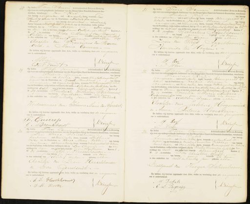 Op heden Twee Januari Achttienhonderd Zeven-en-Zeventig zijn voor ons ondergeteekende Ambtenaar van den Burgerlijken Stand der Gemeente Amsterdam, verschenen. Frederik Ross. van beroep aanspreker oud achtentwintig Jaren, wonende Bloemgracht 87. bekende van de Overledene, en Jacobus Heeren. van beroep aanspreken oud zesendertig Jaren, wonende Wittenburgerdwarsstraat 4 van de Overledene, welke hebben verklaard, dat op Een en dertig December laatstleden des na bekend middags ten half acht ure, va Dethuis, staande groote Wittenburgerstraat Kanton 1 No. 16, is overleden Gerhardus Appelboom.- van beroep geen. wonende als boven in den ouderdom van zeventien dagen geboren alhier. zoon van Thijs Appelboom, en Hendrika ten Hoopen. En hebben wij hiervan opgemaakt deze Akte, welke na voorlezing door de aangevers en ons is onderteekend. J Ros Driessen L. Heeren Op heden Twee Januari Achttienhonderd teven-en-Zeventig, zijn voor ons ondergeteekende Ambtenaar van den Burgerlijken Stand der Gemeente Amsterdam, verschenen: Fredrik, Grirrep. van beroep aanspreker oud zestig Jaren, wonende kleine Kattenburgerstraat 57 bekende van de Overledene, en Gerrit, Bronkhorst, van beroep aanspreker oud negen enveertig Jaren, wonende Oostenburgergracht 47 bekende, van de Overledene, welke hebben verklaard, dat op Een en dertig December laatstleden des na middags ten acht ure, in het huis, staande ridderstraat.- Kanton 1 N. 59, is overleden Friedrich Wilhelm, Pohlmann, van beroep broodbakker wonende als boven in den ouderdom van acht en zestig jaren geboren te Waldeck- Weduwenaar van: Johanna Maria van Sprakel. En hebben wij hiervan opgemaakt deze Acte, welke na voorlezing door de aangezeers en, ons is onderteekend. S. Guirrep Driessen G. Bronkhorst Op heden Twee Januari Achttienhonderd Zeven-en-Zeventig zijn voor ons ondergeteekende Ambtenaar van den Burgerlijken Stand der Gemeente Amsterdam, verschenen: Franciscus Rost. van beroep Aanspreker oud achtentwintig Jaren, wonende Bloemgracht 87. bekende van de Overledene, en acobus Heeren van beroep Aanspreker oud zesendertig Jaren, wonende Wittenburgerdwarsstraat 4 bekende van de Overledene, welke hebben verklaard, dat op Een en dertig December laatstleden des voor middags ten zeven ure, in het huis, staande Korte Leidsched warspraat Kanton 2 No 19, is overleden Cornelia Maria Antonia, Hoogewoonink an beroep geen wonende als boven. in den ouderdom van - achttien, dagen geboren alhier. dochter. van Jacobus, Hoogewoonink en Anna, Antonia Hogesteijn. En hebben wij hiervan opgemaakt deze Akte, welke na voorlezing door de aangevers en ons is onderteekend. F Roof Driessen J Heeele. Op heden Twee Januari Achttienhonderd Zeten-en-zeventig, zijn voor ons oudergeteekende Ambtenaar van den Burgerlijken Stand der Gemeente Amsterdam, verschenen: Leon Isaal Vleeschhouwer. van beroep koopman oud twee endertig Jaren, wonende Sterfhuis vader van de Overledene, en ssaal Moses. Koster van beroep koopman oud negenentwintig Jaren, wonende Uilenburgerstraat 88 bekende van de Overledene, welke hebben verklaard, dat op Een dezer. des na middags ten negen ure, in het huis, staande Joden Houttuinen Kanton 1 No. 34, is overleden Letje, Bleeschhouwer. van beroep — geen wonende als boven in den ouderdom van drie weken geboren alhier dochter van Leon Vleeschhouwer en Eva Goudsmit En hebben wij hiervan opgemaakt Deze Acte, welke na voorlezing door de aangevers en ons is onderteekend. L. J. Vleeschhouwer Driessen J: M. Koster Op heden Twee Januari Achttienhonderd Zeven-en-zeventig, zijn voor ons ondergeteekende Ambtenaar van den Burgerlijken Stand der Gemeente Amsterdam, verschenen: Willem Subels van beroep tanspreker oud drieen viftig Jaren, wonende anjelierstraat 181. bekende van de Overledene, en Cornelis, Laurentius Poppezijn.- van beroep broodbakker oud vieren vijftig Jaren, wonende Keizersgracht 30, bekende van de Overledene, welke hebben verklaard, dat op Dertig December laats bodes na middags ten Acht ure, inhet huis, staande Bloemstraat Kanton 4. No. 10, is overleden Cva Christina, Smit. van beroep — geen wonende als boven in den ouderdom van acht enveertig jaren geboren alhier Ochtgenoot van: Wieger Scheerboom. En hebben wij hiervan opgemaakt deze Akte, welke na voorlezing door de aangevers en ons is onderteekend. W Subels Driessen C. L: Doppezijn.
