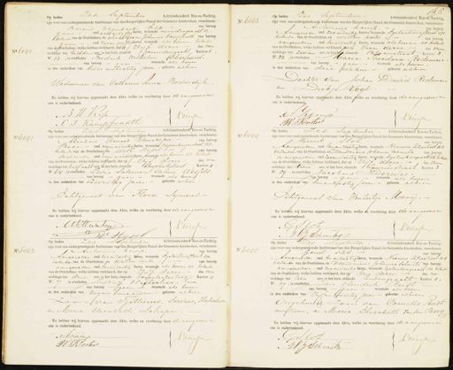 middags ten tien ure, in het huis, staande 1 Laurierstraat Kanton 3 No. 59, is overleden Jacobus Derwel van beroep — geen wonende als boven in den ouderdom van Een enzestig Jaren. geboren alhier Echtgenoot Van Woutertje Mooij En hebben wij hiervan opgemaakt deze Akte, welke na voorlezing door de aangevers en ons is onderteekend. G Slot Driessen — HJSchmits No. 6042 Op heden Zes September Achttienhonderd Een-en-Tachtig zijn voor ons ondergeteekende Ambtenaar van den Burgerlijken Stand der Gemeente Amsterdam, verschenen van beroep Antonius Kemp. Aanspreker oud zesendertig Jaren, wonende Egelantiersstraat 171. bekende van de Overledene, en Willem koster van beroep aanspreken oud Eenendertig Jaren, wonende als boven 111 bekende van de Overledene, welke hebben verklaard, dat op yd dezer des voor middags ten drie ure, in het huis, staande. Engelschesteeg Kanton 4 No. 7, is overleden Jozes Hulscher. van beroepgeen wonende als boven in den ouderdom van negen maanden. geboren alhier Zoom van Tjittinus, Servaas, Hulscher en Maria Elisabeth Schepen En hebben wij hiervan opgemaakt deze Akte, welke na voorlezing door de aangevers en ons is onderteekend. A Kemp Diiesten W. Koster No. 6045 7 Op heden Zes. September Achttienhonderd Een-en-Tachtig, zijn voor ons ondergeteekende Ambtenaar van den Burgerlijken Stand der Gemeente Amsterdam, verschenen Gerrit Slot. van beroep tanspréker oud Een enzestig Jaren, wonende Nieuwe Leliestraat 103 bekende van de Overledene, en Hendricus Johannes Schmitz van beroep aanspreker. oud zes enveertig Jaren, wonende Egelantiersgracht 136 bekende van de Overledene, welke hebben verklaard, dat op drie dezer des na