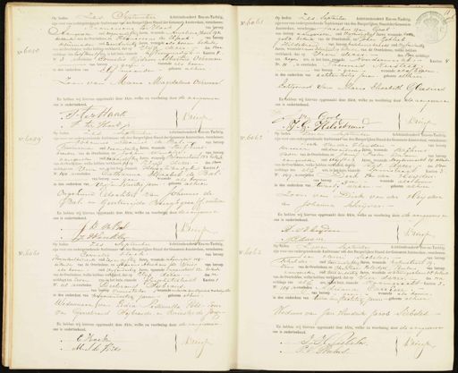 No 6058 Zes September Achttienhonderd Een-en-Tachtig, Op heden zijn voor ons ondergeteekende Ambtenaar van den Burgerlijken Stand der Gemeente Amsterdam, verschenen: Franciscus verHaak van beroep Aanspreker oud negenenvyftig Jaren, wonende Anjeliersstraat 192 bekende van de Overledene, en Franciscus ter Elaak van beroep kleermaker oud zesentwintig Jaren, wonende als boven bekende van de Overledene, welke hebben verklaard, dat op Elijf dezer des voor middags ten half twaalf ure, in het huis, staande Nieuwendijk — Kanton 4 No. 3, is overleden Cornelis Gideon Albertus Overman van beroep geen wonende als boven in den ouderdom van Elf maanden geboren alhier zoon van Maria Magdalena Overman, En hebben wij hiervan opgemaakt deze Akte, welke na voorlezing door de aangeveisen ons is onderteekend. WA S Pverttaak Driessen aat Jr No. 6061 1 1 Op heden Zes. September Achttienhonderd Een-en-Tachtig zijn voor ons ondergeteekende Ambtenaar van den Burgerlijken Stand der Gemeente Amsterdam, verschenen: Jacobus van Gout C van beroep aanspreker oud vijfenvyftig Jaren wonende katten gat8. bekende van de Overledene, en Johan Gotlieb Hildebraud van beroep paschinisknecht oud vyf en Seertig Jaren, wonende nieuwe Leliestraat 119 bekende van de Overledene, welke hebben verklaard, dat op vier dezer des voor middags ten negen ure, in het huis, staande Noordermarkt Kanton 4 No. 11, is overleden Theunis Nusteeg van beroep - geen wonende als6oven in den ouderdom van achtenzestig jaren. geboren alhier Echtgenoot Ian Maria Elisabeth Glaseus En hebben wij hiervan opgemaakt deze Akte, welke na voorlezing door de aangevers en ons is onderteekend. Coll SJ VOor G vV Driessn J. G. Heldebrauw No. 6059 1 Op heden Zes. September Achttienhonderd ten en-Tachtig zijn voor ons ondergeteekende Ambtenaar van den Burgerlijken Stand der Gemeente Amsterdam, verschenen Johannes Daniel de Bal.— van beroep timmerman oud zesendertig Jaren, wonende sterfhuis. broeder van de Overledene, en Johan Winkler van beroep aanspreker oud tweeenviftig Jaren, wonende Bloemstraat 133 bekende van de Overledene, welke hebben verklaard, dat op Elijs dezer des voor middags ten Hier ure, in het huis, staande Hotogtekadijk Kanton 1 No. 140, is overleden Catharina Elizabet de Bal- van beroep — geen wonende als boven in den ouderdom van vyf en veertig Jaren. geboren alhier Ongehuwd dochter van Johannes de Bal. en Geertruida Burgkgraaff, overleden En hebben wij hiervan opgemaakt deze Akte, welke na voorlezing door de aangevers en ons is onderteekend. J D Chn Kreesten J. Winkler No. 6062 Op heden zeven September Achttienhonderd Een-en-Tachtig zijn voor ons ondergeteekende Ambtenaar van den Burgerlijken Stand der Gemeente Amsterdam, verschenen Dirk Van der Heyden.— van beroep Krivier oud drieendertig Jaren, wonende sterfhuis Vader van de Overledene, en Jan Pieter Daam van beroep aanspreker oud vyftig Jaren, wonende Noordermarkt 34. bekende van de Overledene, welke hebben verklaard, datop zes dezer des voor middags ten elf ure, in het huis, staande Sjustraat Kanton 3 No. 149, is overleden Dirk van der Heijden. van beroep — geen wonende als boven in den ouderdom van twaalf weken. geboren alhier Dirk van der „ zoon van Heijden en Johanna Schrijver. En hebben wijhiervan opgemaakt deze Akte, welke na voorlezing door de aangevers en ons is onderteekend. D. Vdheijden Driessen. P Danm No. 6060 Op heden zes September Achttienhonderd Een-en-Tachtig, zijn voor ons ondergeteekende Ambtenaar van den Burgerlijken Stand der Gemeente Amsterdam, verschenen van beroep Cornelis Hoek tlospitaalbediende oud zes en vyftig Jaren, wonende oetgenspad 114. bekende van de Overledene, en Marius Abraham de Dries van beroep als boven. oud vijfendertig Jaren, wonende Dapperstraat 22. bekende „ van de Overledene, welke hebben verklaard, dat op rlijf dezer des na middags ten zeven ure in het huis, staande Sarphatistraat Kanton 1 No. 108, is overleden Gerbrand Sijbrans. van beroep vuurstoker wonende aan boord van zijn is Majesteits wachtschip alhier in den ouderdom van negenendertig jaren.— geboren alhier Weduwnaar van Lidia Pieternella Pols. - Zoon van Gerrebrand Sijbrands, en Knieske de Jong.- En hebben wij hiervan opgemaakt deze Akte, welke na voorlezing door de aangeveers en ons is onderteekend. C Hoek. Diceelen M. A de Vries No. 6063 P Danm Op Heden Zieven September Achttienhonderd Een-en-Tachtig zijn voor ons ondergeteekende Ambtenaar van den Burgerlijken Stand der Gemeente Amsterdam, verschenen Jean Henri Siebeles. van beroep