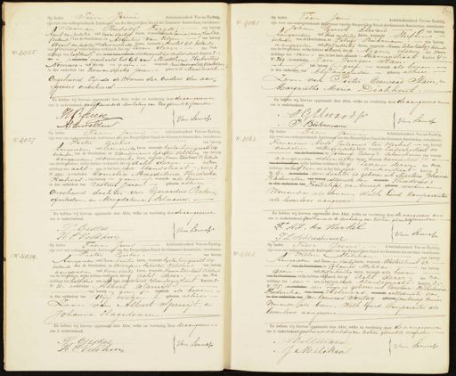 van de Overledene, welke hebben verklaard, dat op Acht dezer de voor middags ten acht- ure, in het huis, staande Elandstraat, Kanton 3 No. 181-, is overleden Cornelia Magdalena Hendrika Kakers.- van beroep — geen. wonende als boven. in den ouderdom van zestien Jaren geboren alhier. Ongehuwd dochter van Gerardus Rakers, overleden, en Magdalena / Blaauw. En hebben wij hiervan opgemaakt deze Akte, welke na voorlezing door de aangevers en ons is onderteekend. P: Giskes Van Lenmept H E. Veldhuis No. 4863 nann. . Op heden tien Juni Achttienhonderd Vier-en-Tachtig zijn voor ons ondergeteekende Ambtenaar van den Burgerlijken Stand der Gemeente Amsterdam, verschenen „ . „ — Franciscus Adolf. Julianus ten Herkel. van beroep winkelier oud tweeendertig Jaren, wonende Leidschestraat 100. van de Overledene, en Johannes Lodewik Schomsheemer van beroep aanspreken oud drie en vyftig Jaren, wonende arnixstraat 78. van de Overtedene, welke hebben verklaard, dit op zeven dezer des na middags ten half zes - ure, in het huis, staande kinkerstraat Kanton 3 No. 9-, is overleden eene dochter is geboren uit Martina Johanna Rademaker van beroep echtgenoote van wonende Theodorus in den ouderdem van kritschij, van beroep geboren werkman wonende als boven, Welk kind Comparanten als levenloos aangeven. En tetted Wy bian opgereadt dere Adg vele op voorenig deor de aangevers en ons is onderteekend. Goedkeurende de doorhaling van zestien gedrukte woorden. Te J ten Herkel L N. LHS Van Lemep J L Schimstumer No. 4859. Op heden Tien Juni Achttienhonderd Vieren-Tachtig zijn voor ons ondergeteekende Ambtenaar van den Burgerlijken Stand der Gemeente Amsterdam, verschenen Pieter Giskes.— van beroep